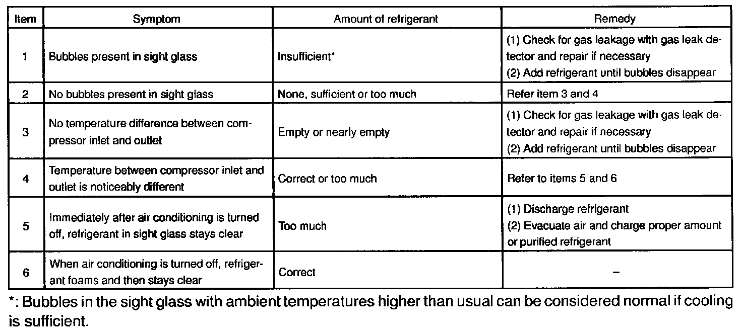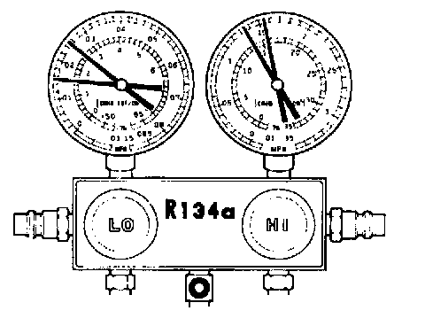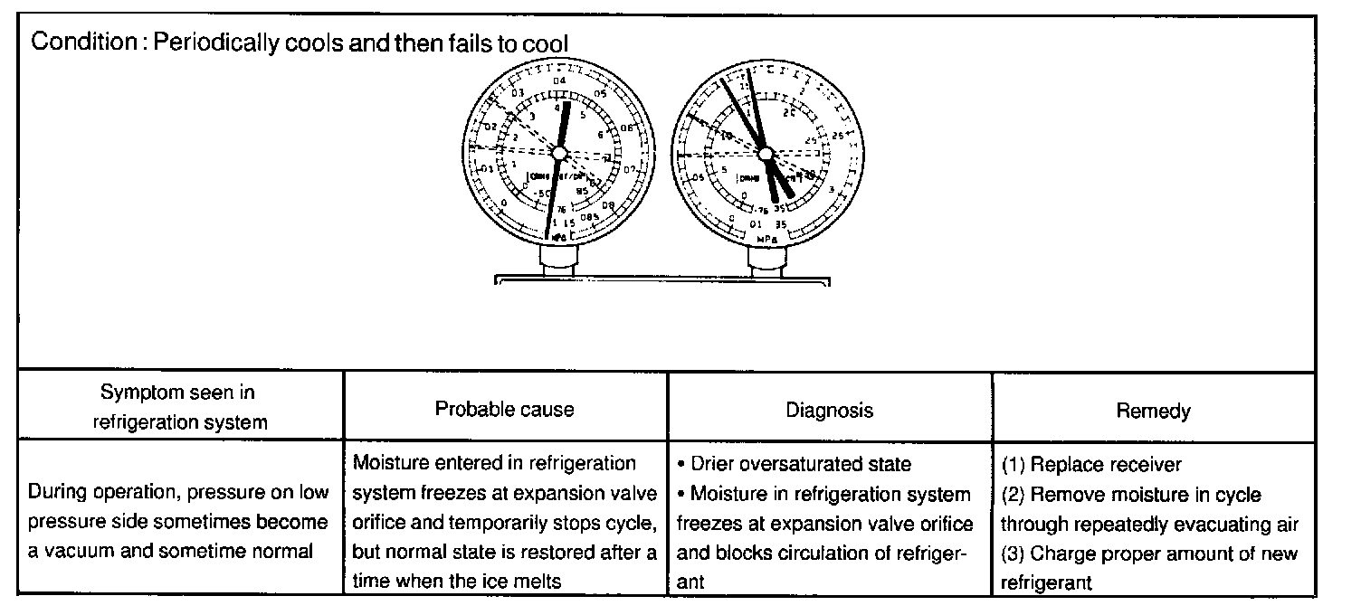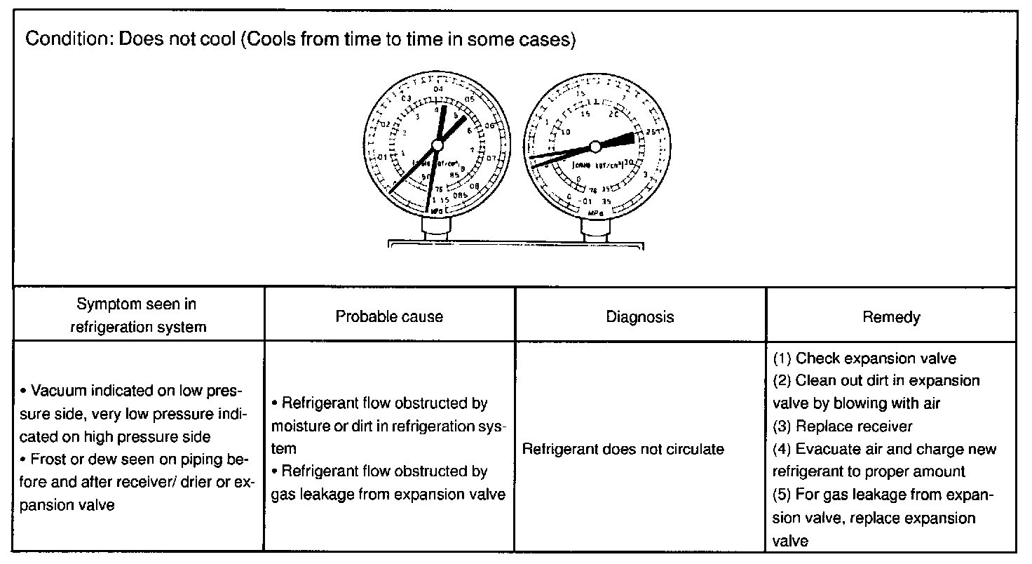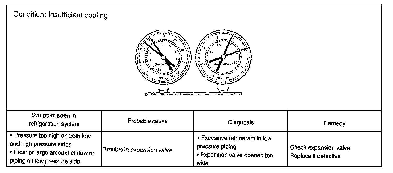 This is a method in which the trouble is located by using a manifold gauge set. Read the manifold gauge pressure when these conditions are established.