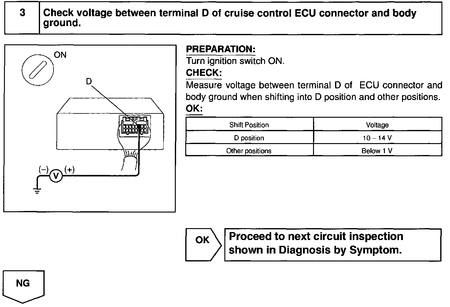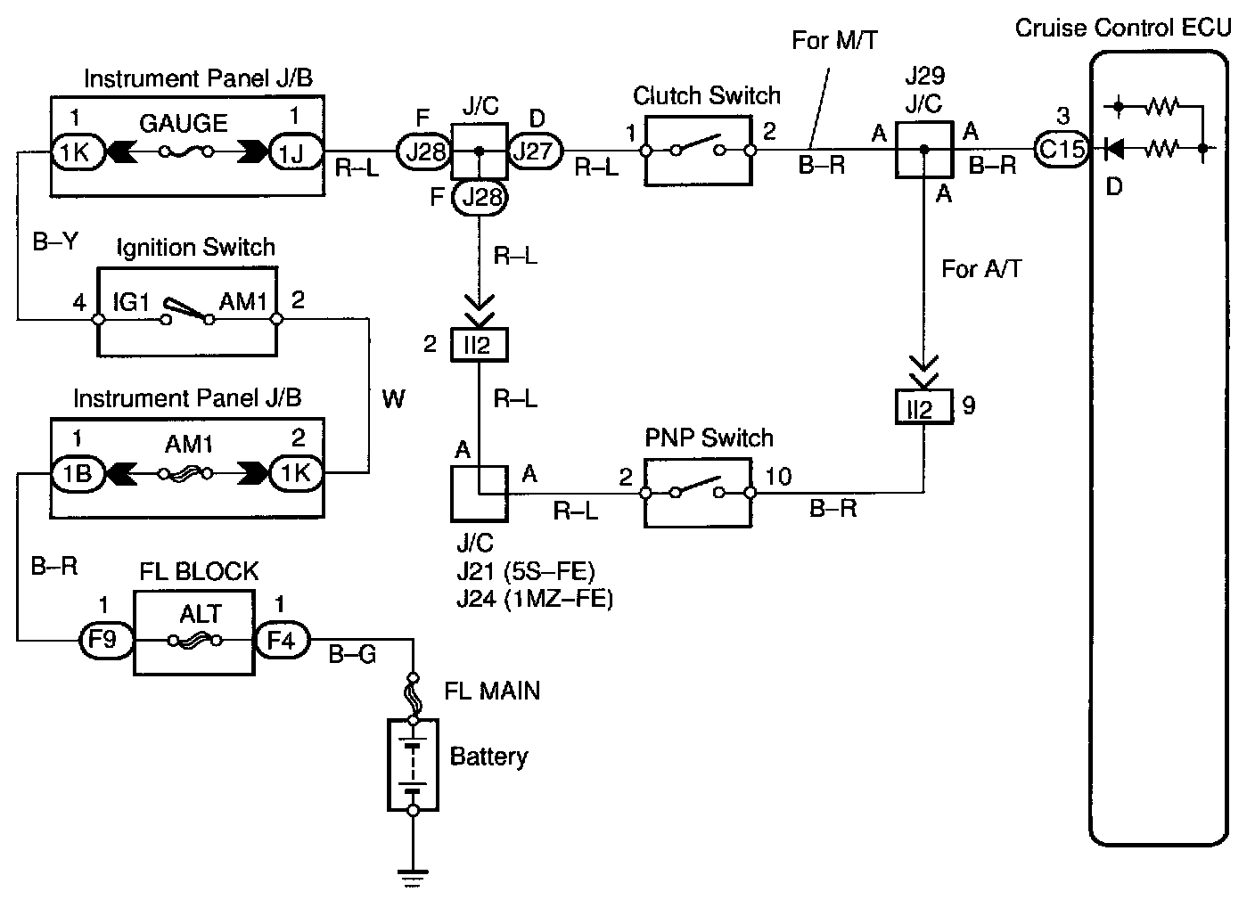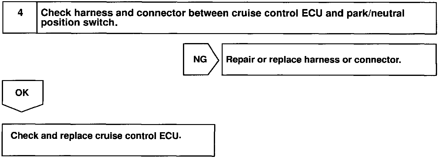 When the shift position is except D, a signal is sent from the park/neutral position switch to the ECU. When this signal is input during cruise control driving, the ECU cancels the cruise control.