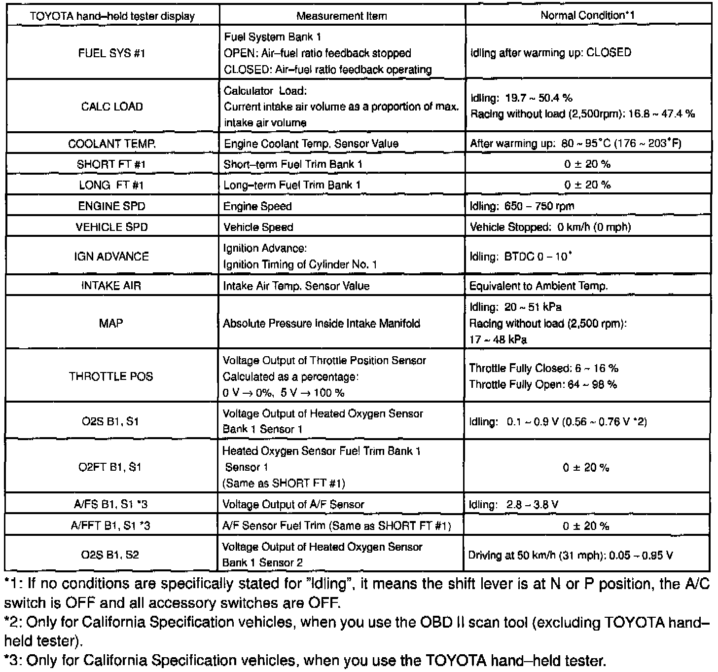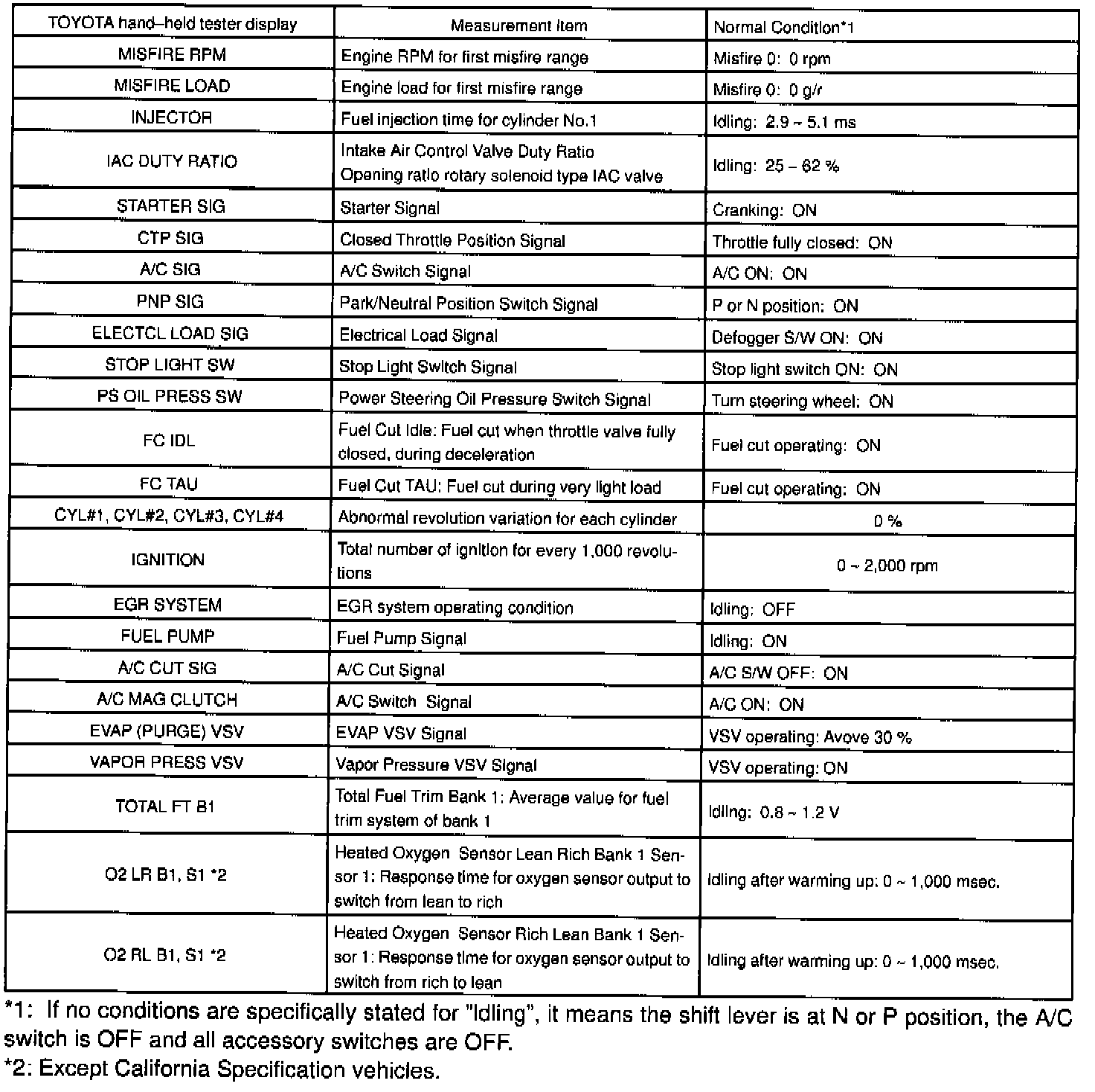 ENGINE OPERATING CONDITIONNOTE: The values given below for "Normal Condition" are representative values, so a vehicle may still be A normal even if its value varies from those listed here. So do not decide whether a part is faulty or not solely according to the "Normal Condition" here.