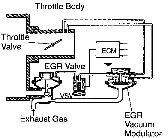 The EGR system recirculates exhaust gas, which is controlled to the proper quantity to suit the driving conditions, into the intake air mixture to slow down combustion, reduce the combustion temperature and reduce NOx emissions. The amount of EGR is regulated by the EGR vacuum modulator according to the engine load.
