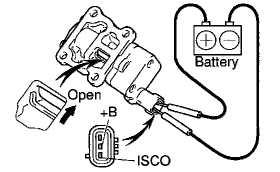 b. Connect the positive (+) lead from the battery to terminal +B and negative (-) lead to terminal ISCO, and check that the valve is open.
