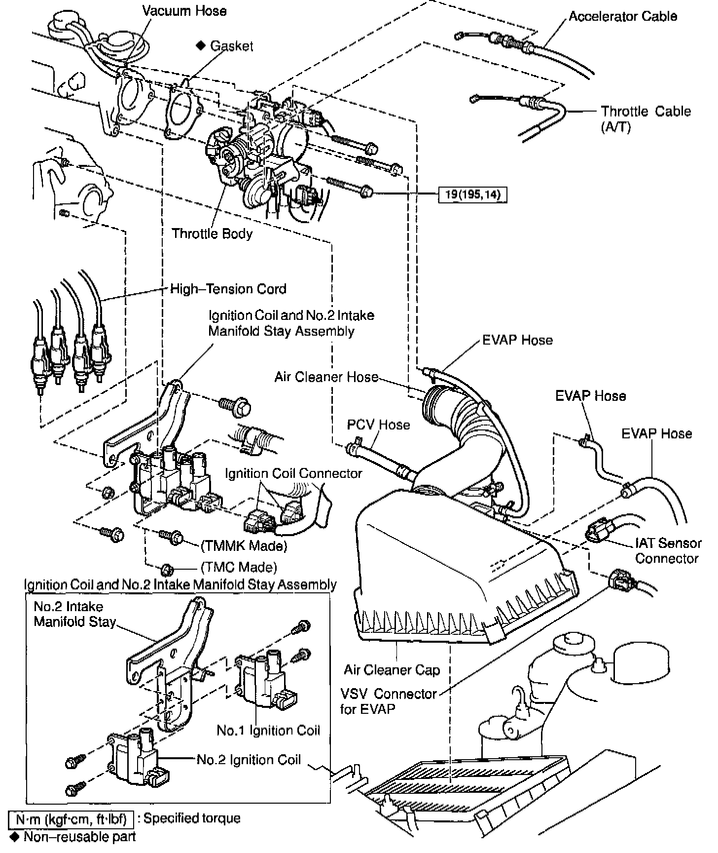 c. TMC Made: Remove the 2 nuts, 2 bolts, 2 ignition coils and manifold stay assembly.