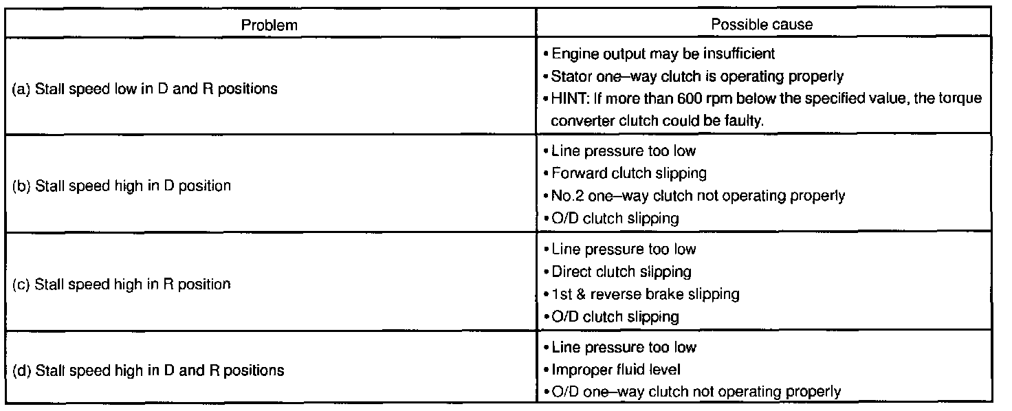 The object of this test is to check the overall performance of the transaxle and engine by measuring the stall speeds in the D and R positions.