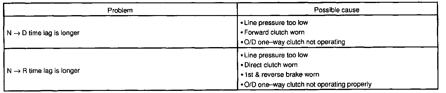 When the shift lever is shifted while the engine is idling, there will be a certain time lapse or lag before the shock can be felt. This is used for checking the condition of the O/D direct clutch, forward clutch, and 1st & reverse brake.