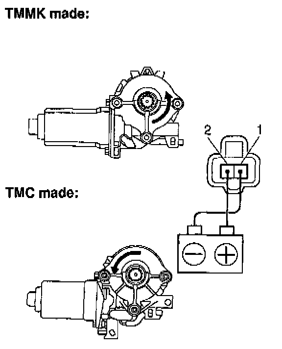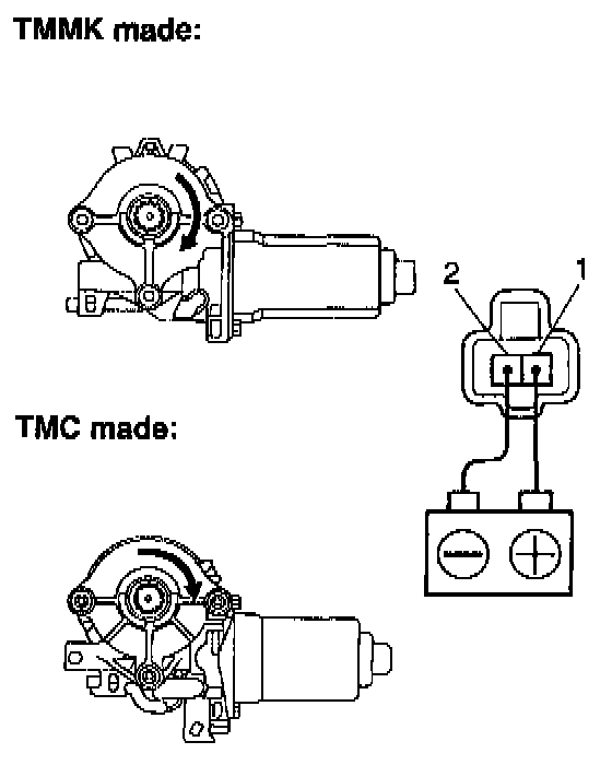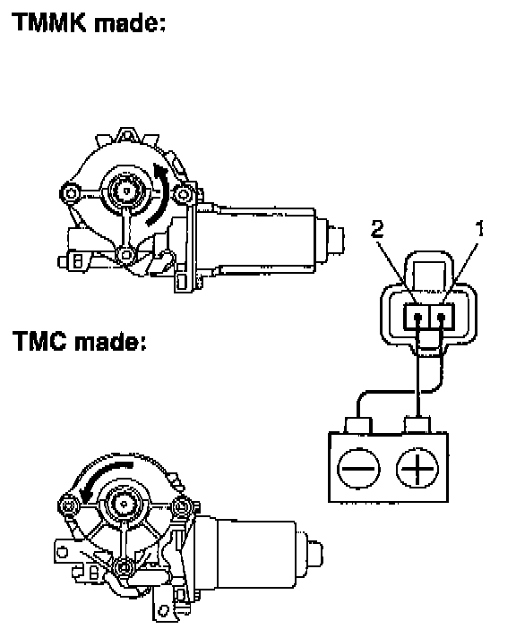 a. Connect the positive (+) lead from the battery to terminal 1 and the negative (-) lead to terminal 2, and check that the motor turns clockwise.