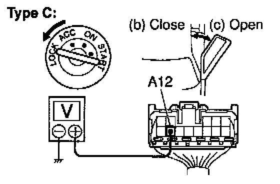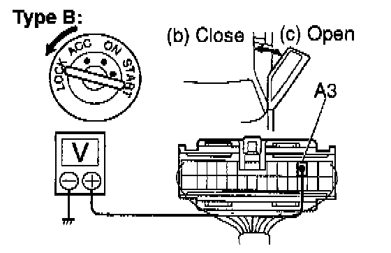 b. Close the door with ignition switch turned to LOCK or ACC, and check that the meter needle indicates battery positive voltage.