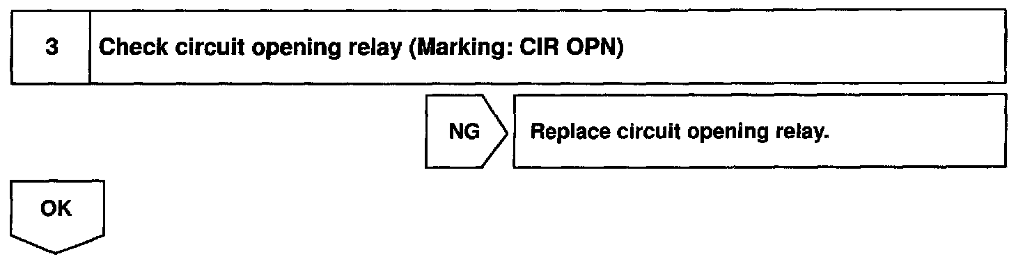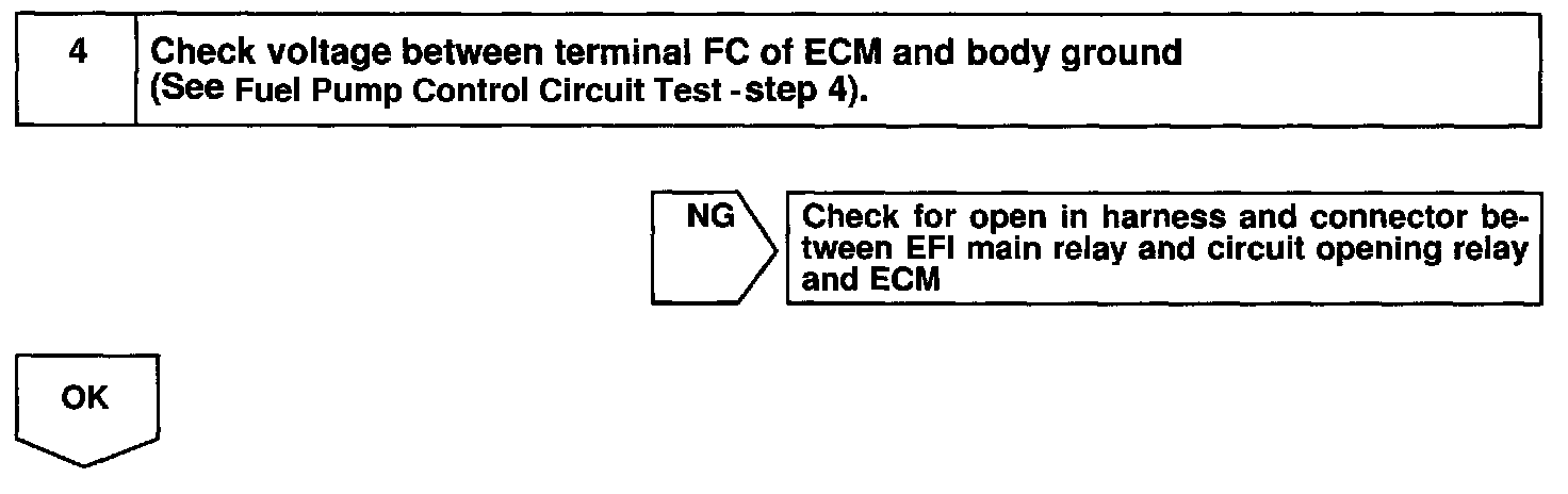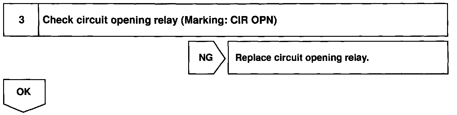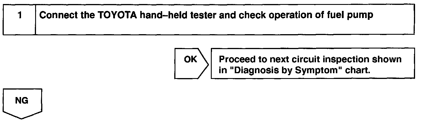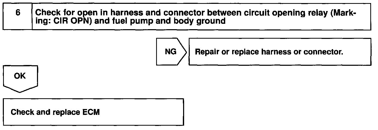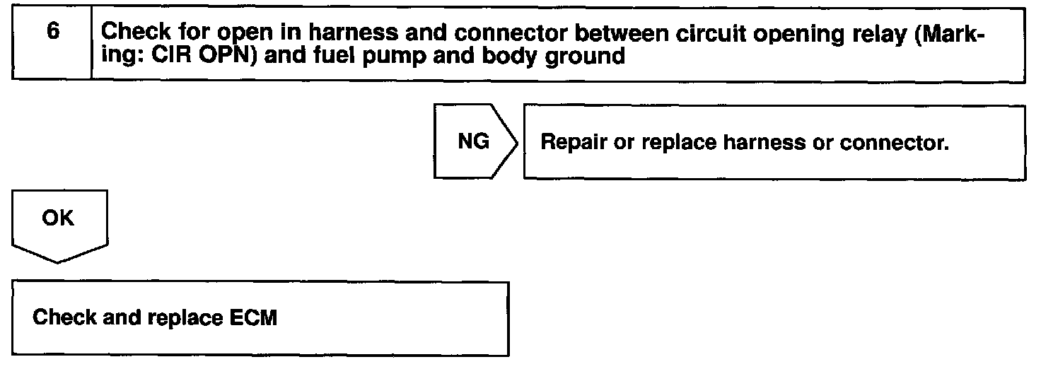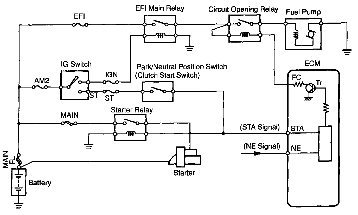 When the STA signal and NE signal are input to the ECM, Tr is turned ON, current flows to coil of the circuit opening relay, the relay switches on, power is supplied to the fuel pump and the fuel pump operates. While the NE signal is generated (engine running), the ECM keeps Tr ON (circuit opening relay ON) and the fuel pump also keeps operating.