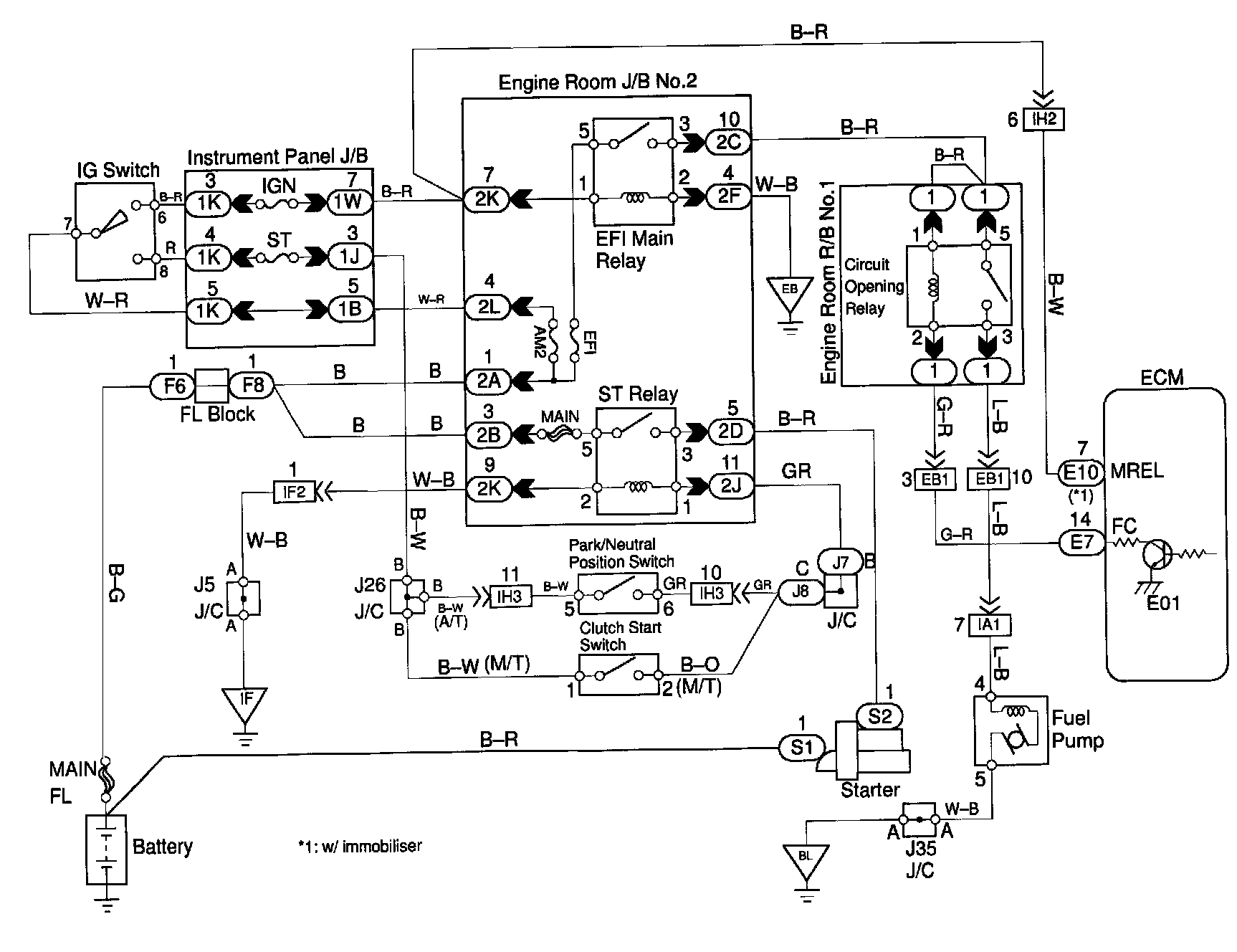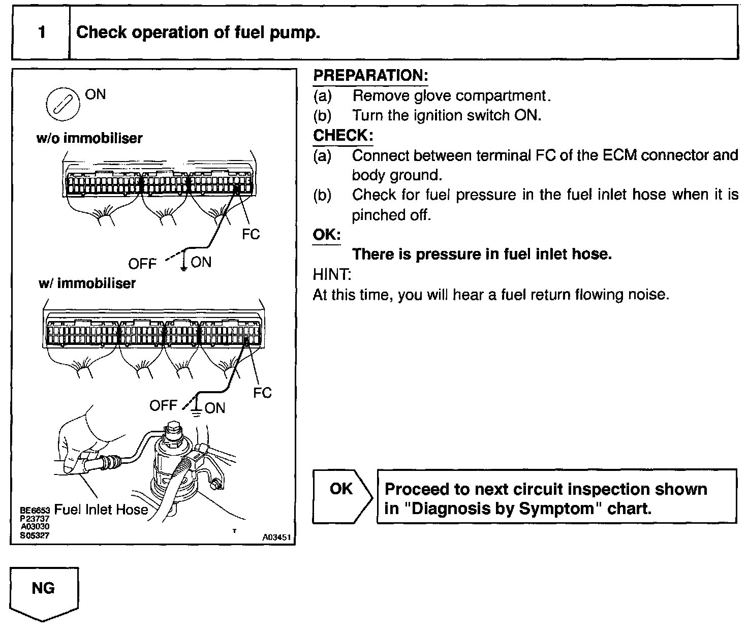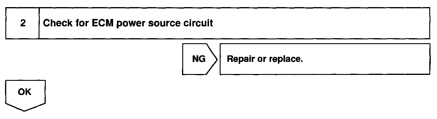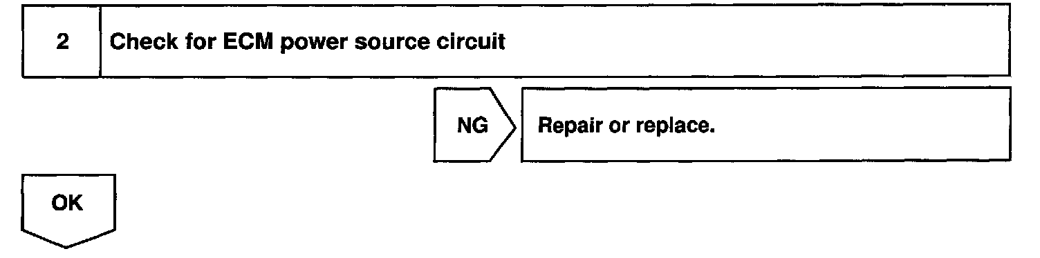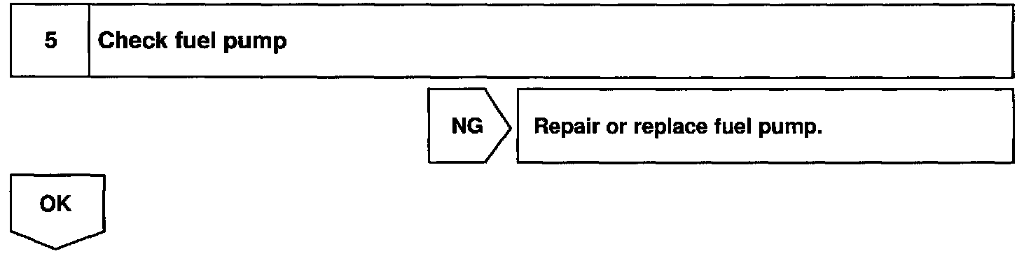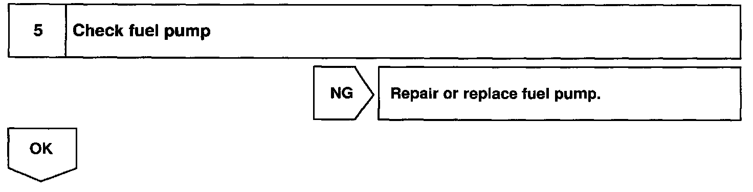 When the STA signal and NE signal are input to the ECM, Tr is turned ON, current flows to coil of the circuit opening relay, the relay switches on, power is supplied to the fuel pump and the fuel pump operates. While the NE signal is generated (engine running), the ECM keeps Tr ON (circuit opening relay ON) and the fuel pump also keeps operating.