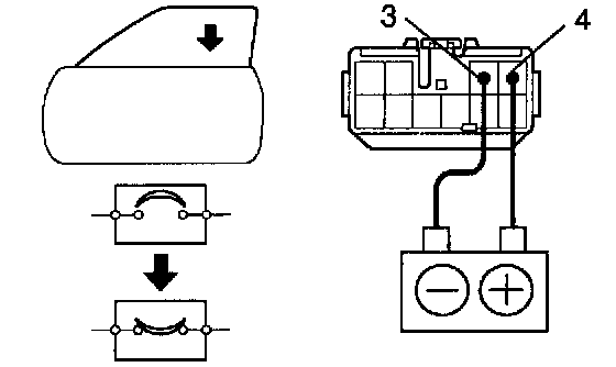 b. Connect the positive (+) lead from the battery to terminal 3 and the negative (-) lead to terminal 4 on the wire harness side connector and raise the window to full closed position.
