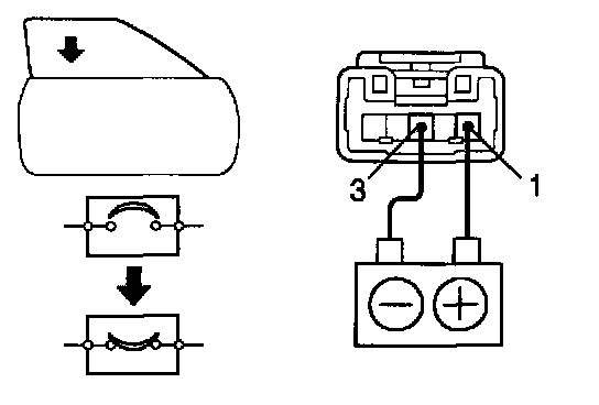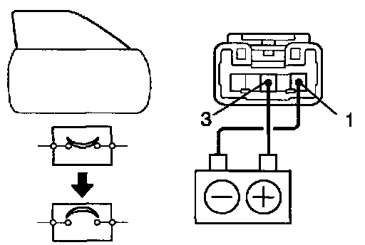 b. Connect the positive (+) lead from the battery to terminal 3 and the negative (-) lead to terminal 1 on the wire harness side connector, and raise the window to full closed position.