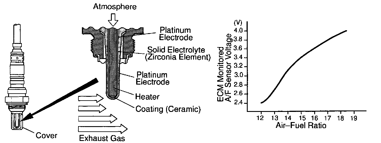 The A/F sensor is equipped with a heater which heats the zirconia element. The heater is controlled by the ECM. When the intake air volume is low (the temp. of the exhaust gas is low), current flows to the heater to heat the sensor for accurate oxygen concentration detection.