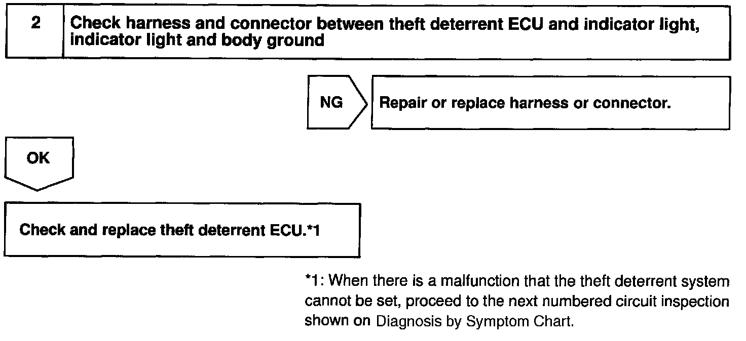 CIRCUIT DESCRIPTIONWhen the theft deterrent system is preparing to set, this circuit lights up the indicator light. When the system has been set, it continuously turns the indicator light on for 0.75 secs. and turns it off for 1.25 secs., thus blinking the indicator light.