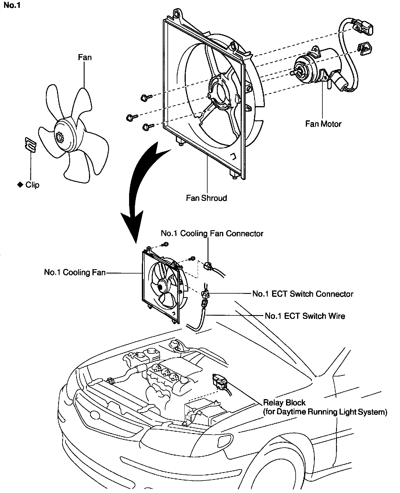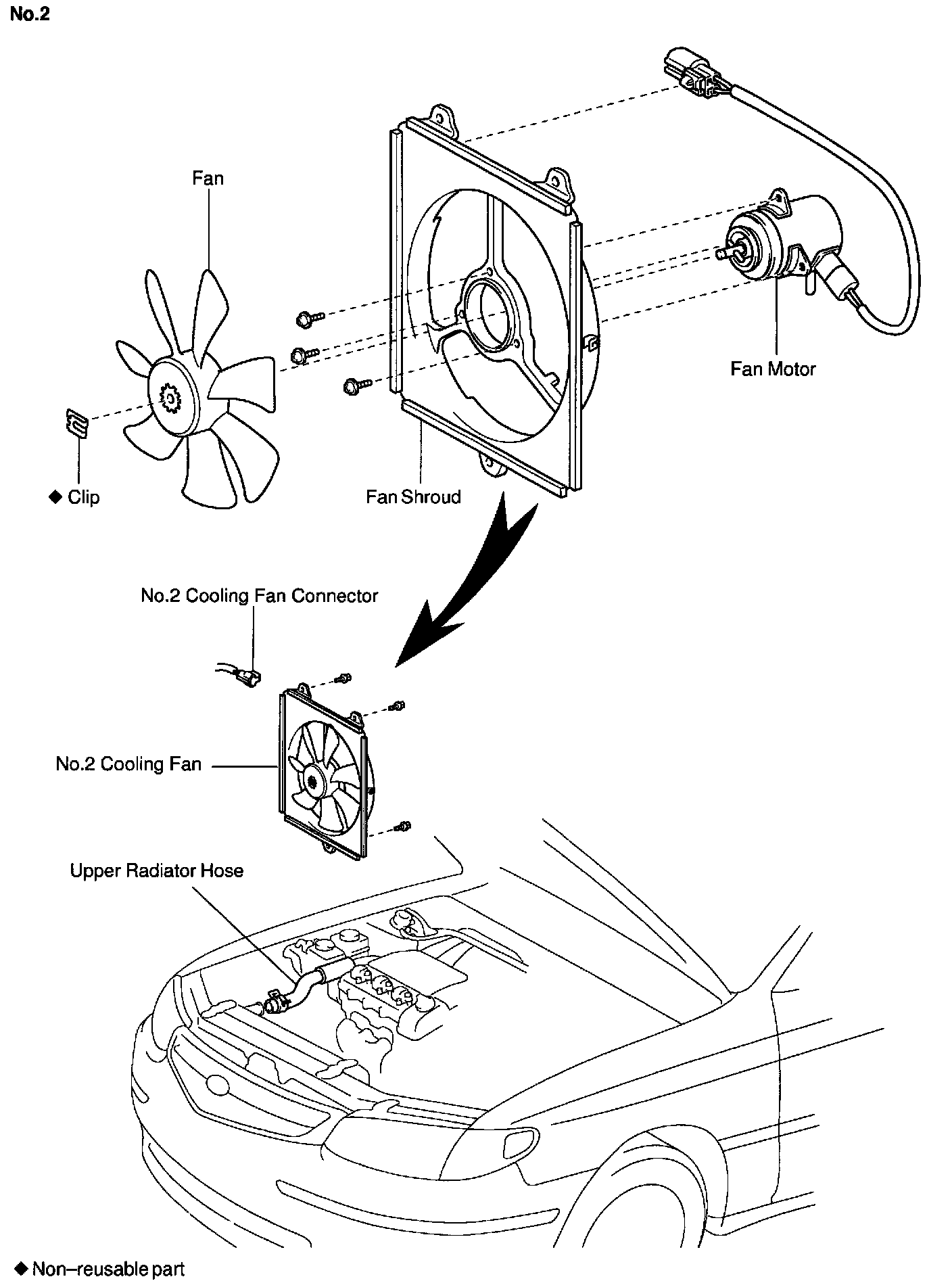 ELECTRIC COOLING FAN UNDERHOOD VIEW, REPLACEMENT AND OVERHAUL W/ RELATED COMPONENTS