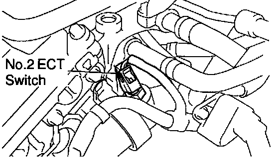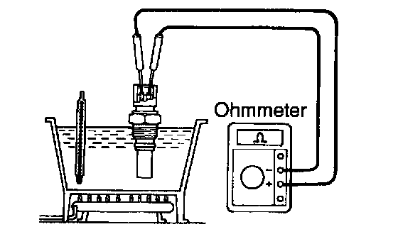 1. Using an ohmmeter, check that there is no continuity between the terminals when the coolant temperature is above 98°C (208°F).