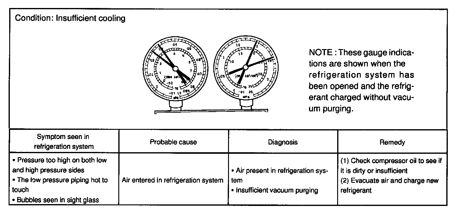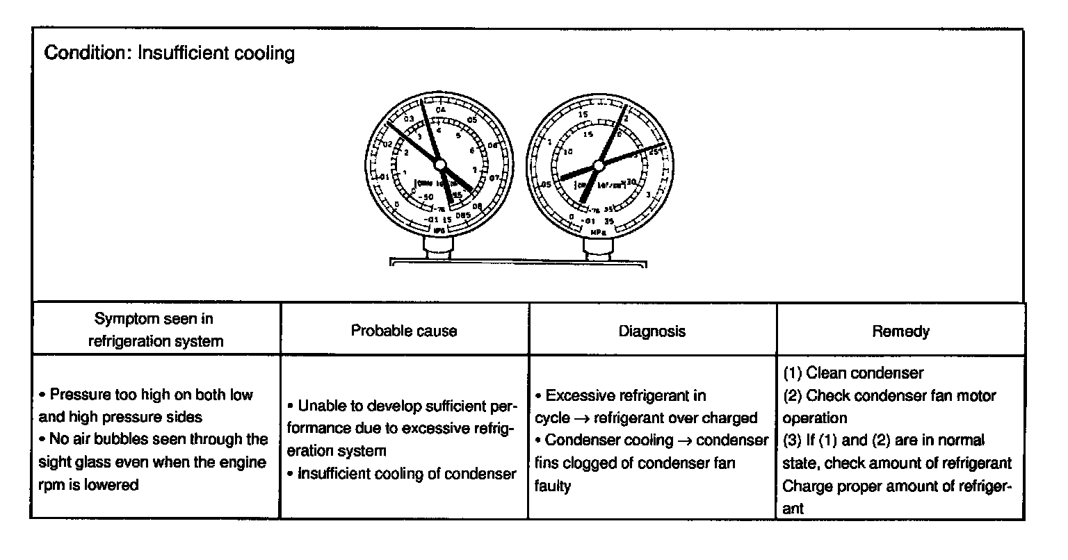 6. Refrigerant overcharged or insufficient cooling of condenser.