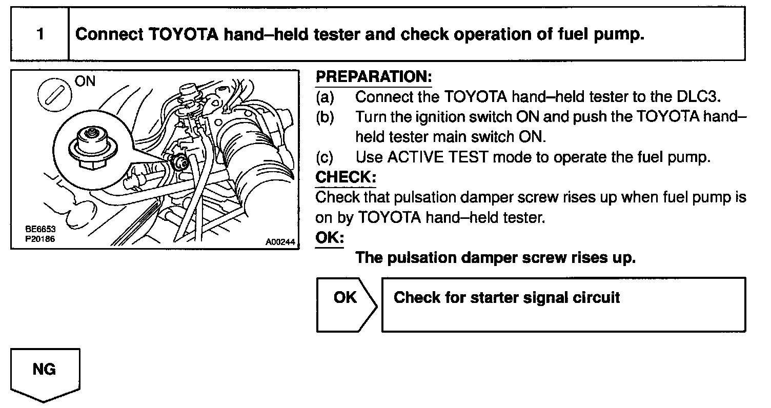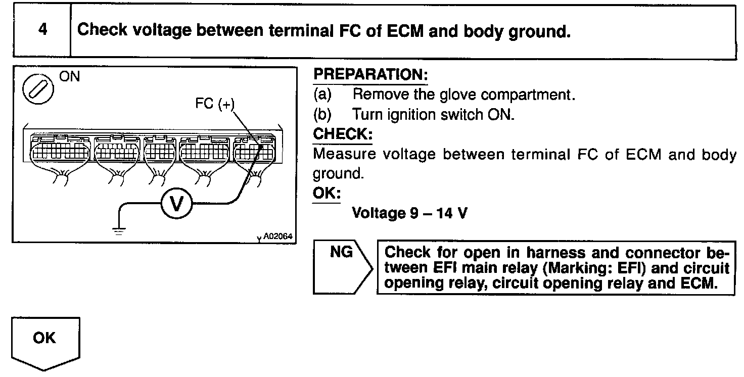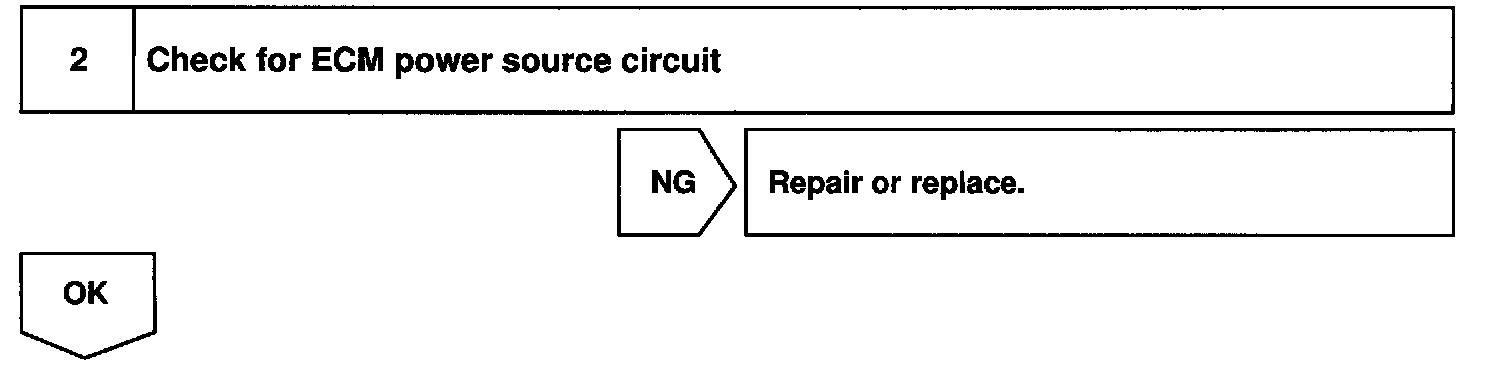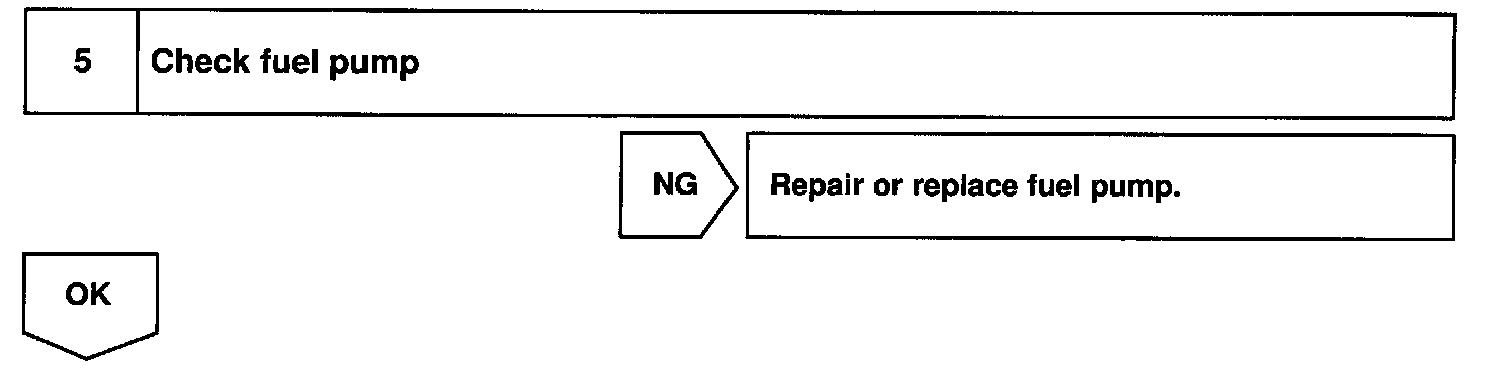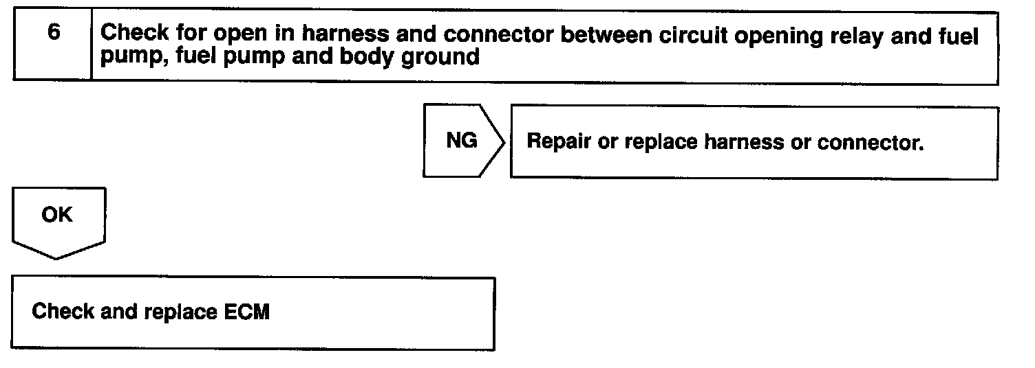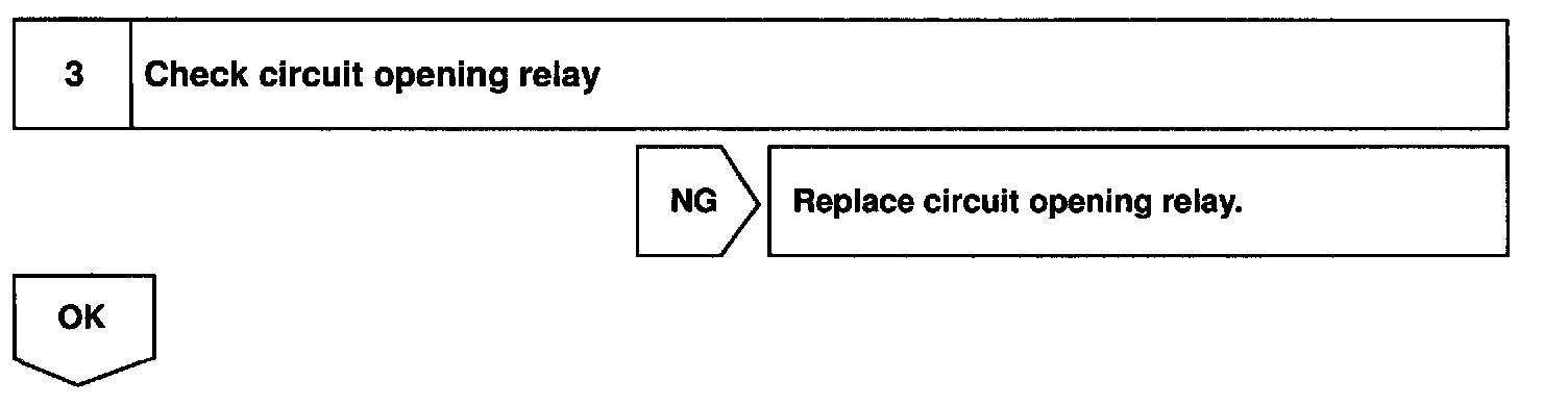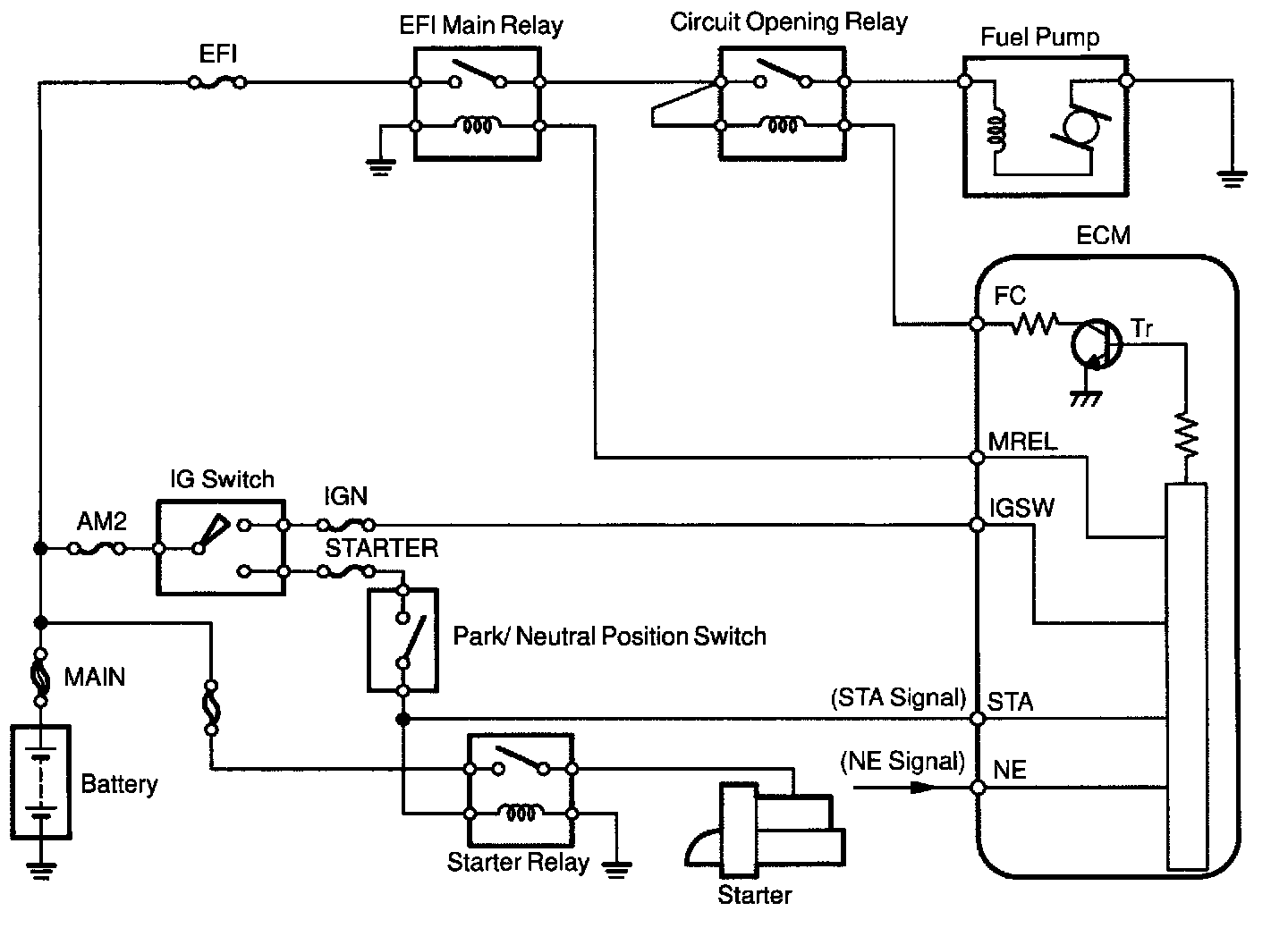 When the STA signal and NE signal are input to the ECM, Try is turned ON, current flows to coil of the circuit opening relay, the relay switches on, power is supplied to the fuel pump and the fuel pump operates. While the NE signal is generated (engine running), the ECM keeps Tr ON (circuit opening relay ON) and the fuel pump also keeps operating.