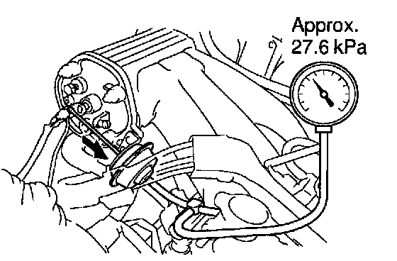 d. Rapidly depress the accelerator pedal to fully open position and check that the vacuum gauge needle momentarily fluctuates up to approx. 26.7 kPa (200 mmHg, 7.9 in.Hg). (The actuator rod is pulled out.)