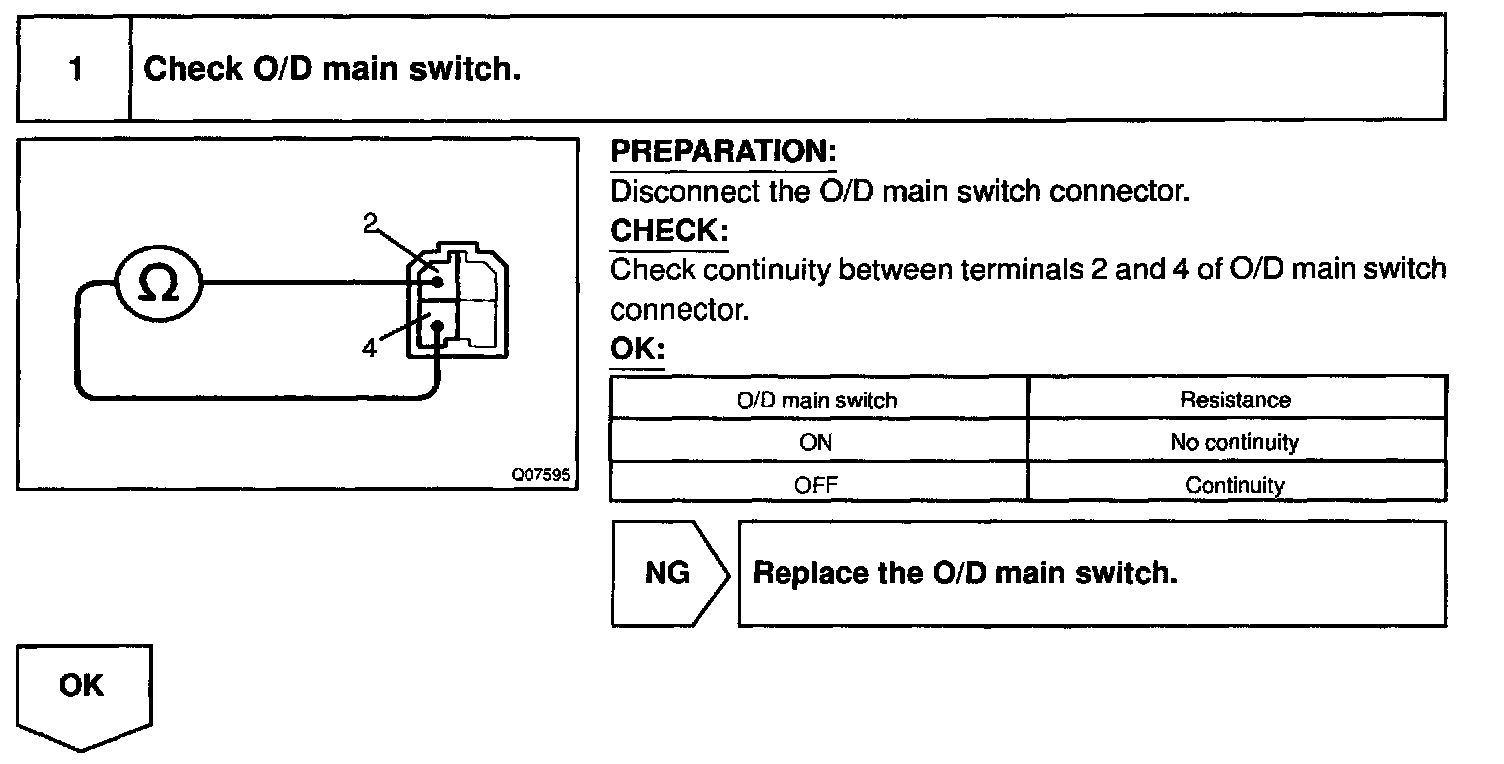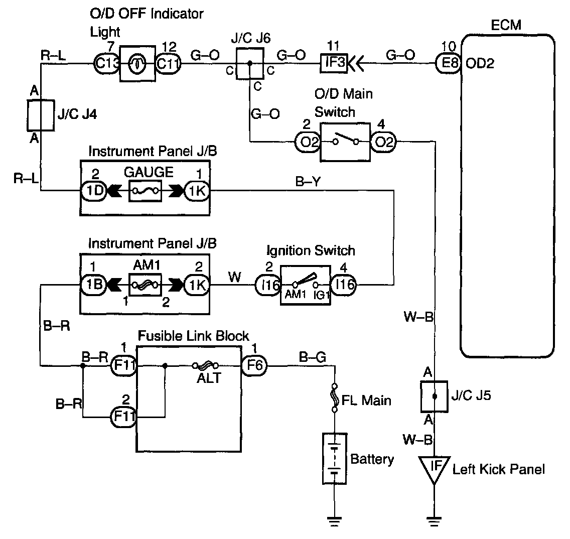 CIRCUIT DESCRIPTIONThe O/D main switch contacts go open when the switch is pushed in and go closed when it is pushed out.