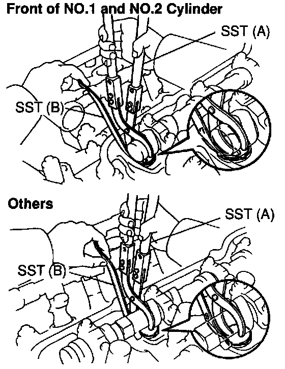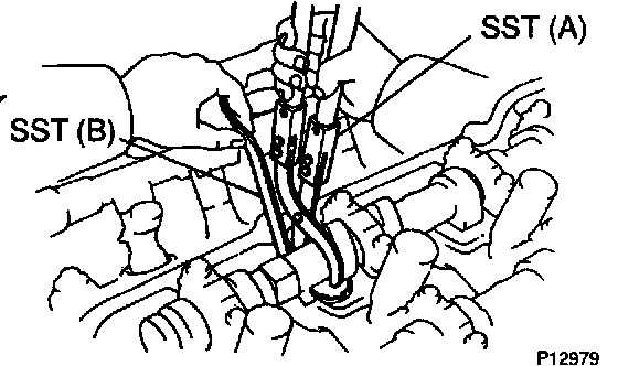 3. Using SST (A), press down the valve lifter and place SST (B) between the camshaft and valve lifter.
