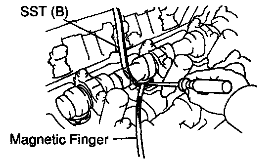 2. Press down the valve lifter with SST (A), and remove SST (B).