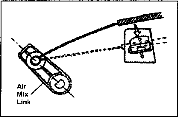 F. Connect the air mix cable connector to the air mix link pin on the left side of the A/C unit and clamp the outer cable to the secure clamp.