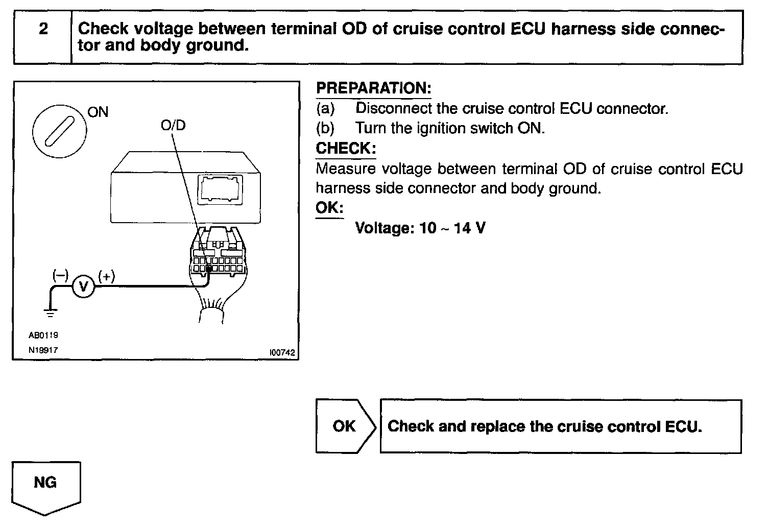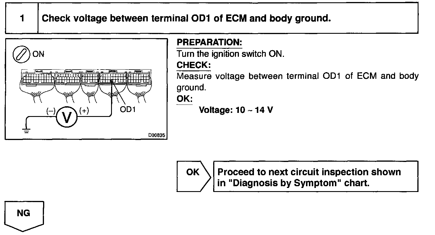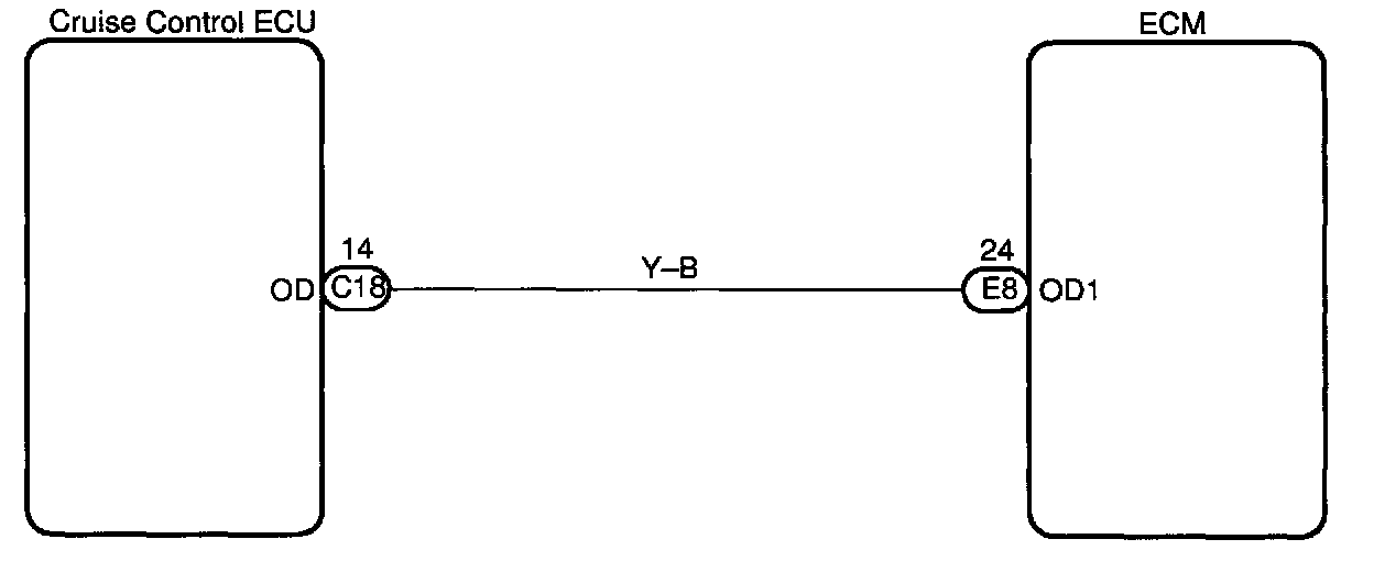 The cruise control ECU sends O/D cut signals to the ECM as necessary and the ECM cancels overdrive shifting until these signals are discontinued.