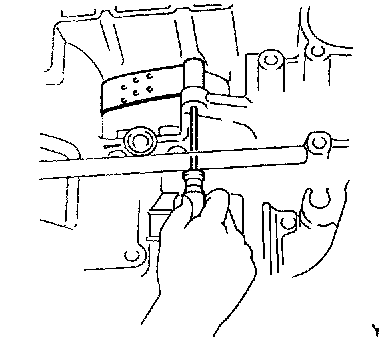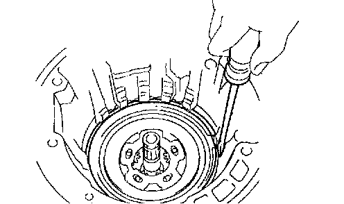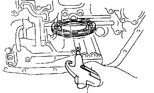 28. REMOVE SECOND COAST BRAKE BANDa. Push the pin with a small screwdriver and remove it from the bolt hole of the oil pump mounting.