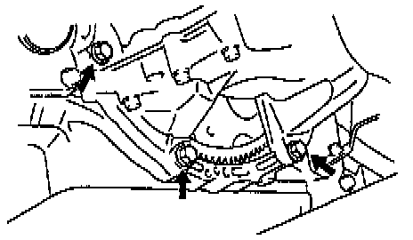 b. Remove the 2 bolts, starter and A/T shift cable clamp.