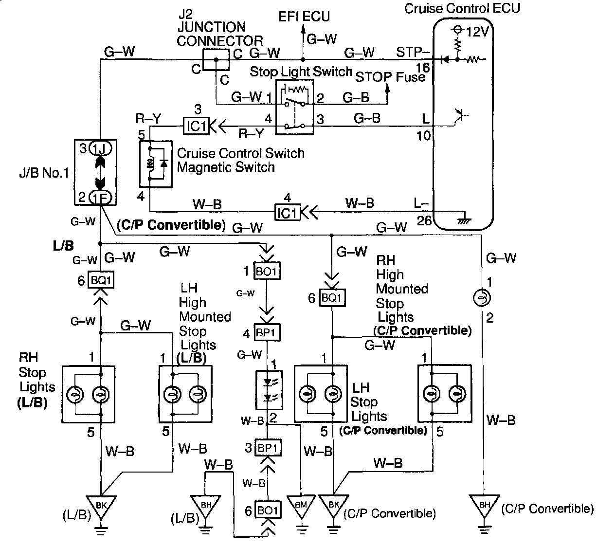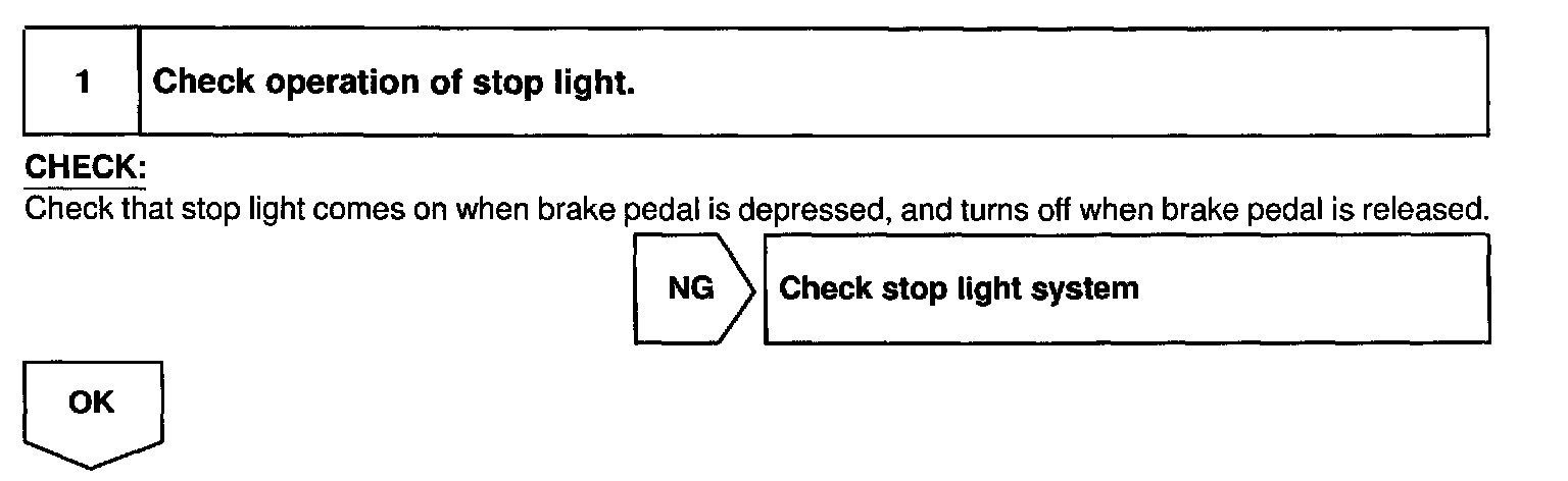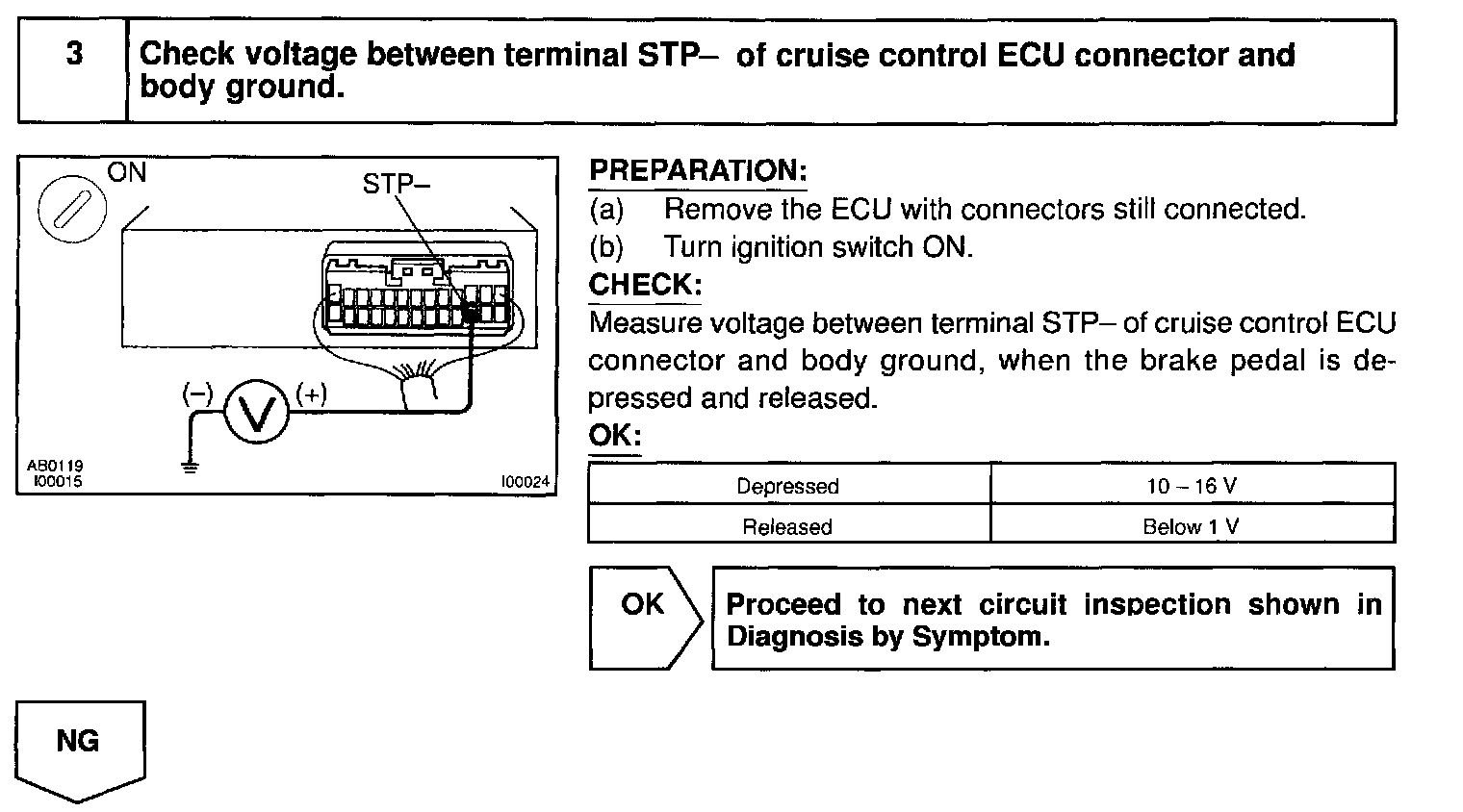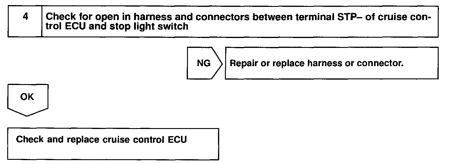 When the brake is ON, battery positive voltage is normally applied through the STOP fuse and stop light switch to terminal STP- of the ECU, and the ECU turns the cruise control OFF. If the harness connected to terminal STP- has an open circuit, terminal STP- will have battery positive voltage and the cruise control will be turned OFF.