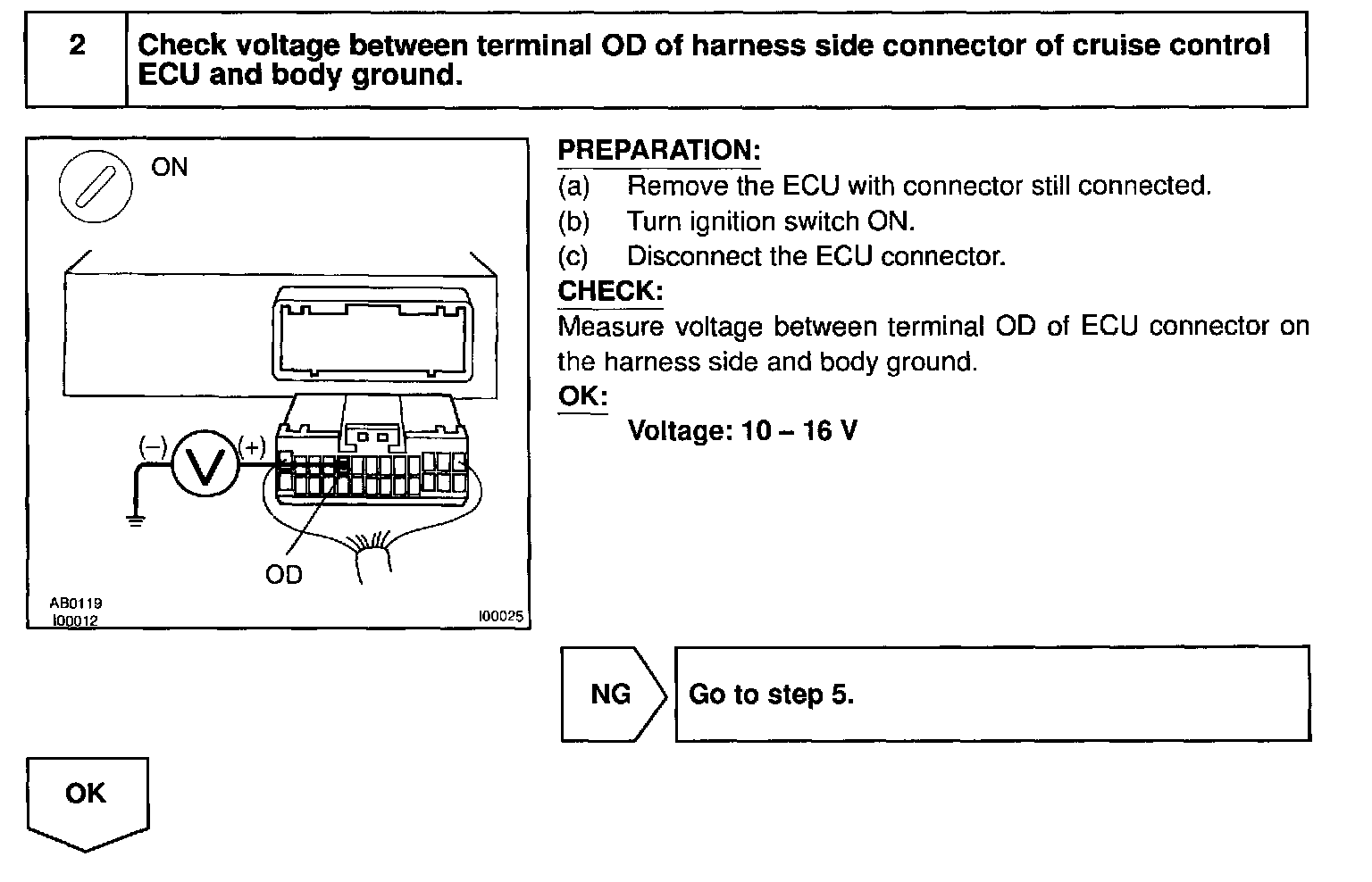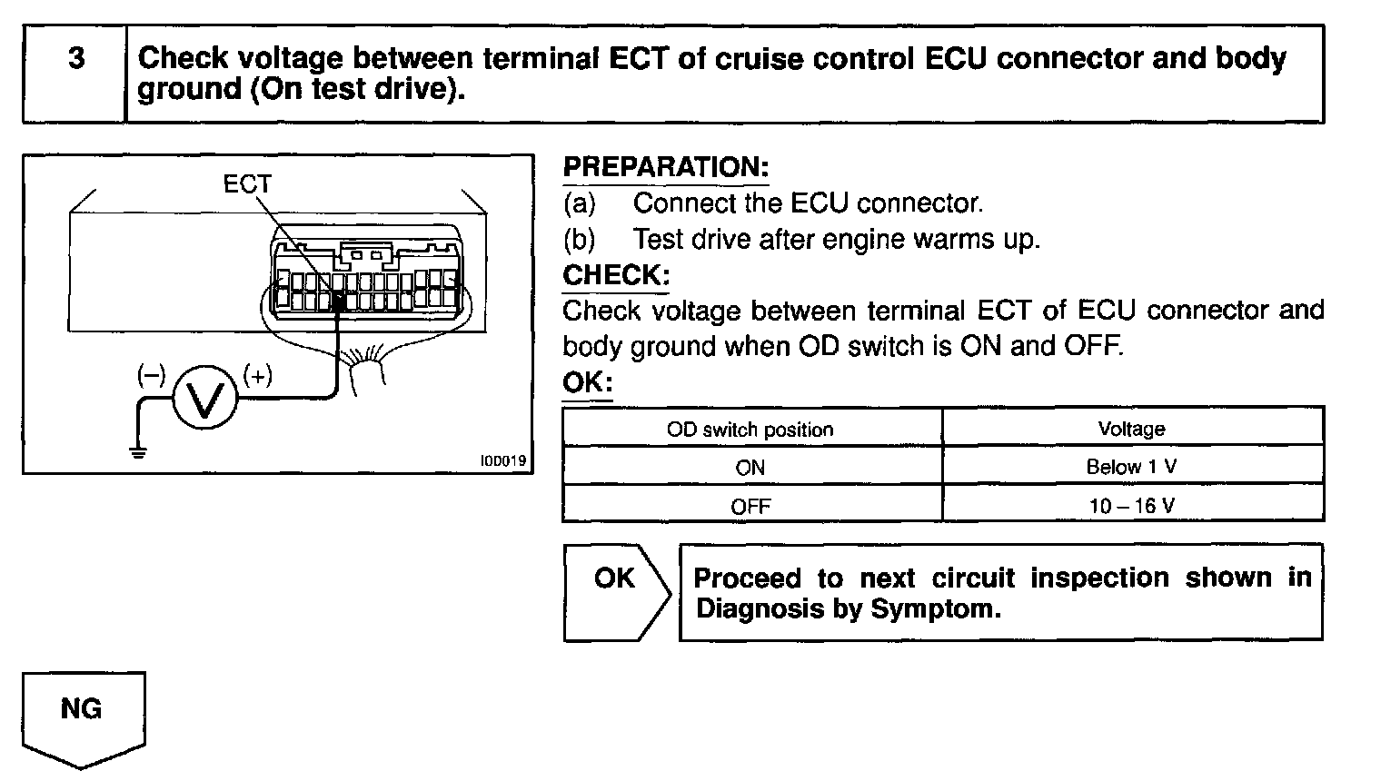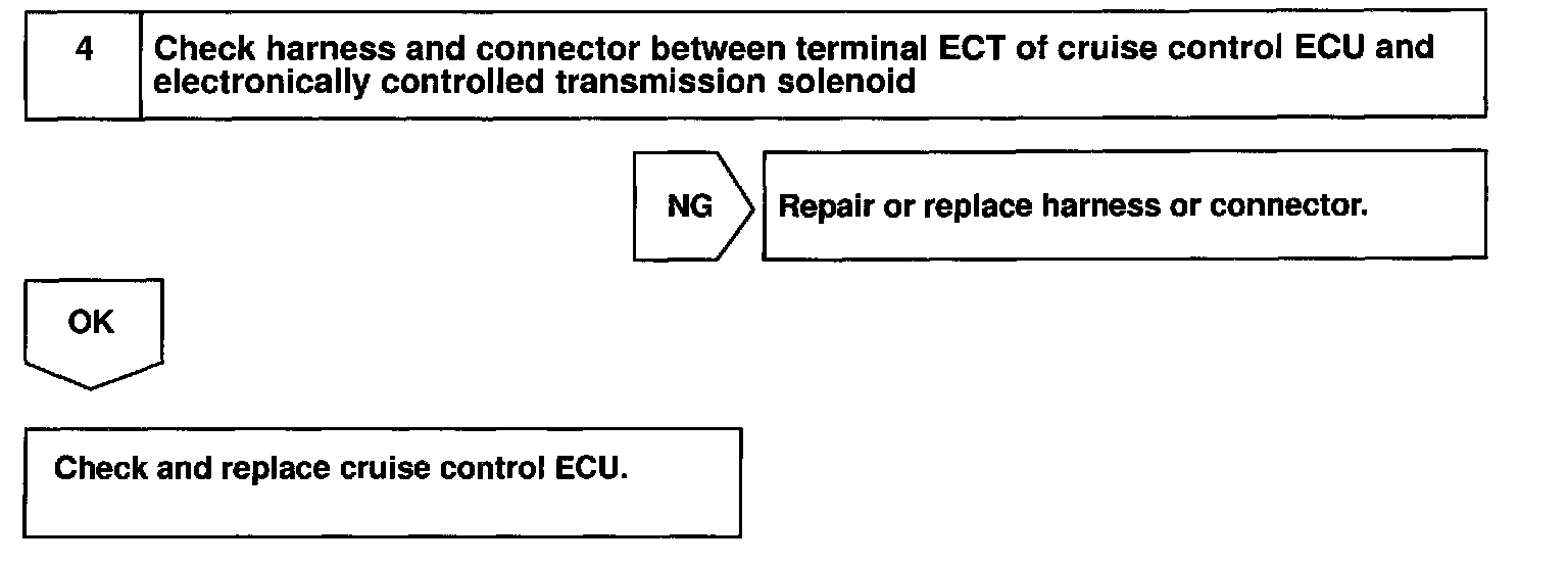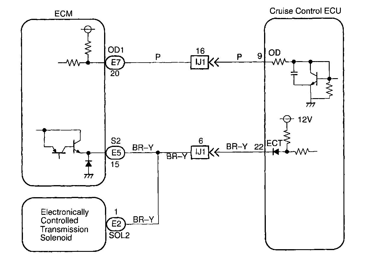 Terminal ECT of the cruise control ECU detects the shift change signal (output to electronically controlled transmission No.2 solenoid) from the ECM.