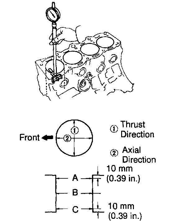 Using a cylinder gauge, measure the cylinder bore diameter at positions A, B and C in the thrust and axial directions.