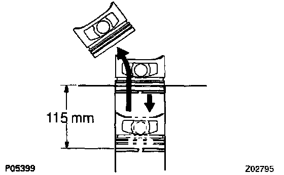 b. Using a piston, push the piston ring a little beyond the bottom of the ring travel, 115 mm (4.53 inch) from the top of the cylinder block.