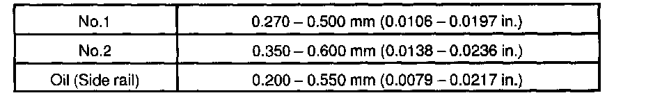 If the end gap is greater than maximum, replace the piston ring. If the end gap is greater than maximum, even with a new piston ring, rebore all the 4 cylinders or replace the cylinder block.