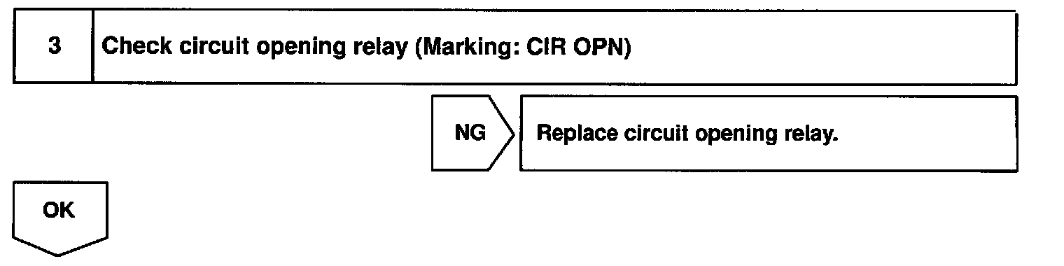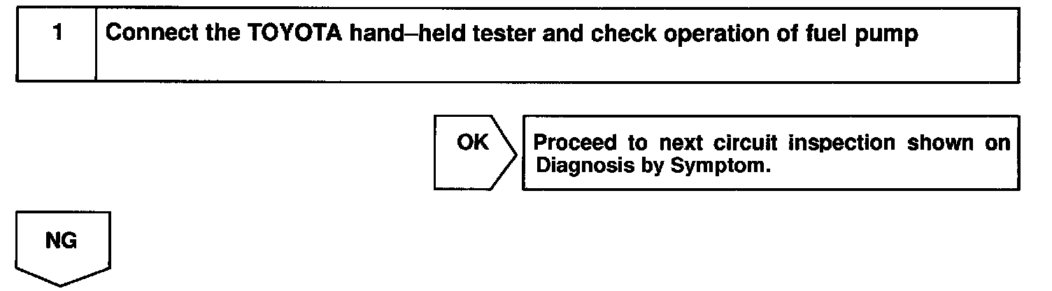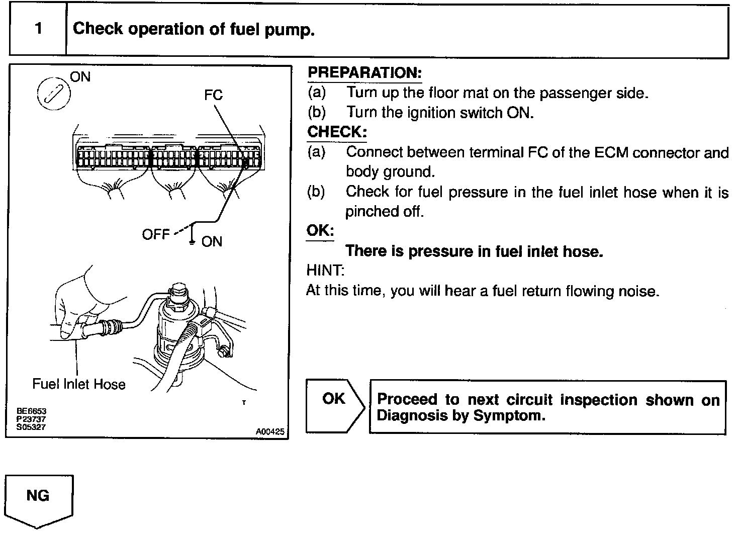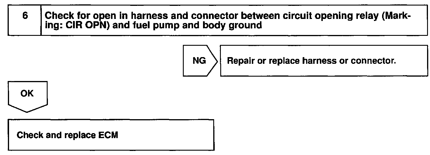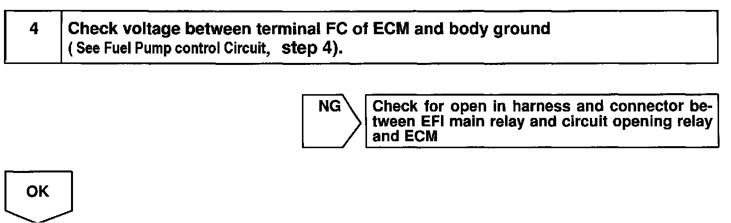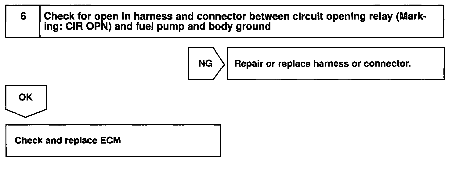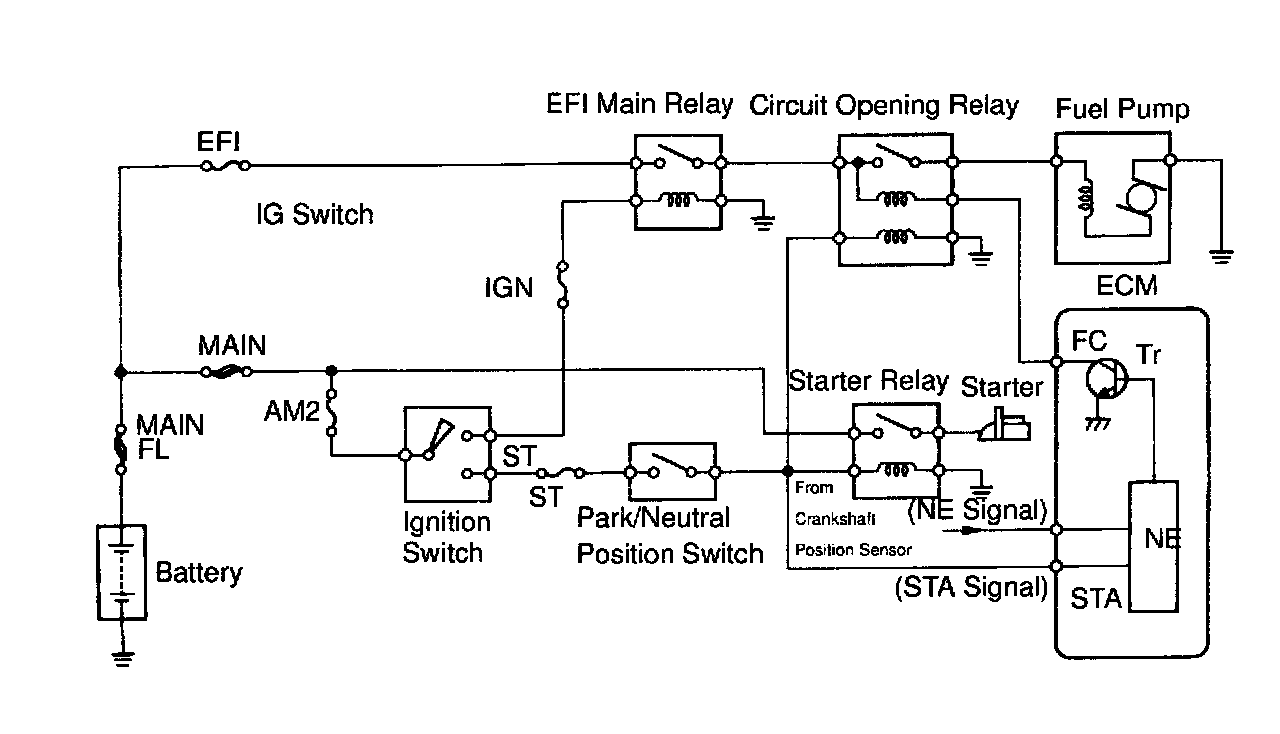 When the STA signal and NE signal are input to the ECM, Tr is turned ON, current flows to coil of the circuit opening relay, the relay switches on, power is supplied to the fuel pump and the fuel pump operates. While the NE signal is generated (engine running), the ECM keeps Tr ON (circuit opening relay ON) and the fuel pump also keeps operating.