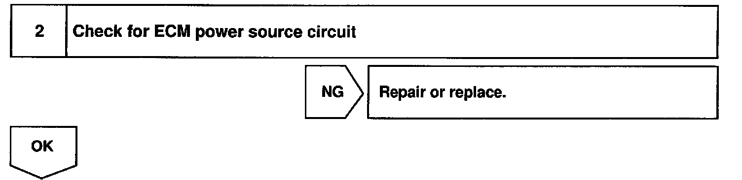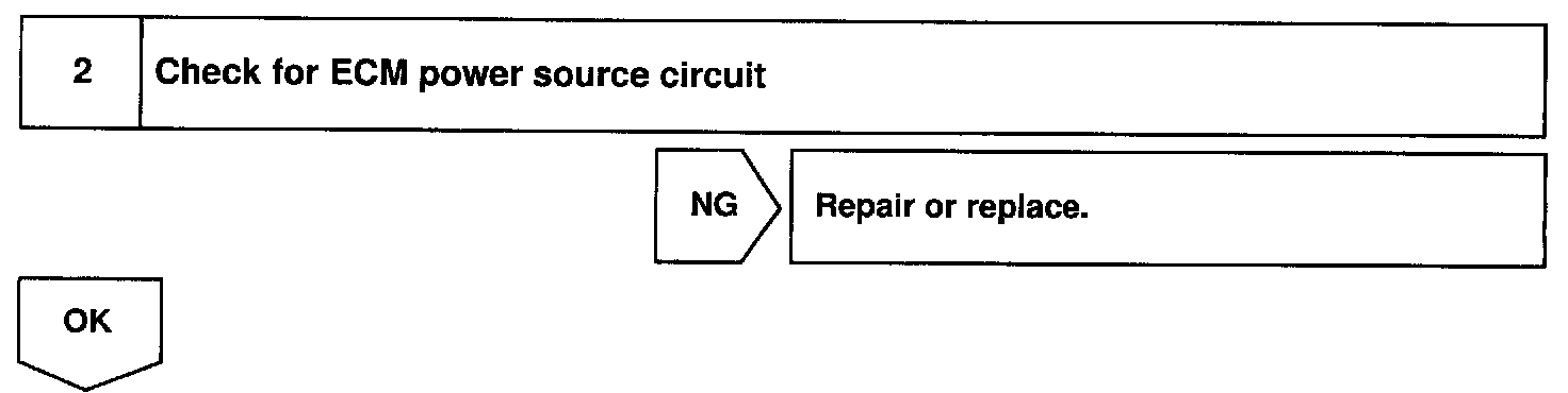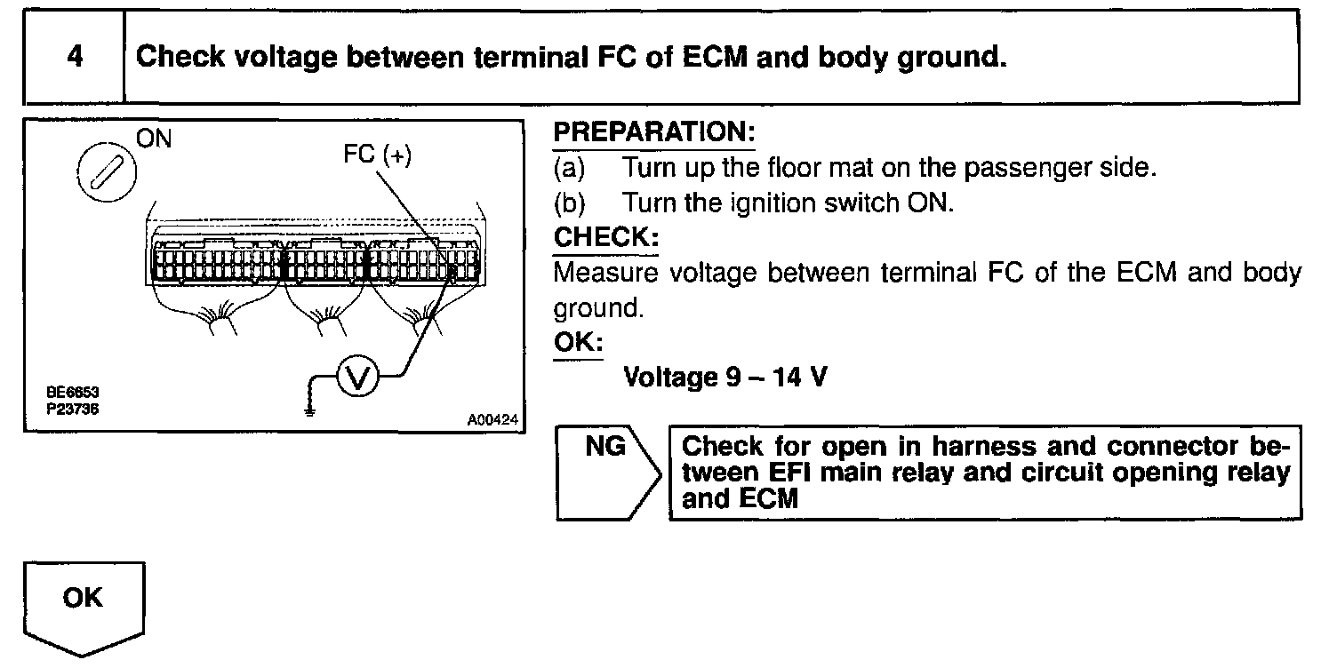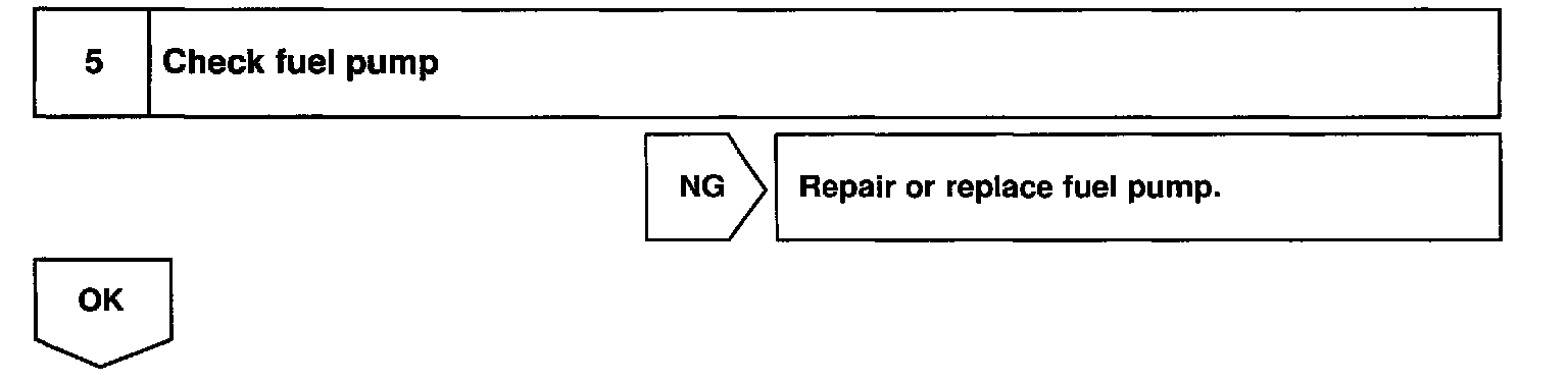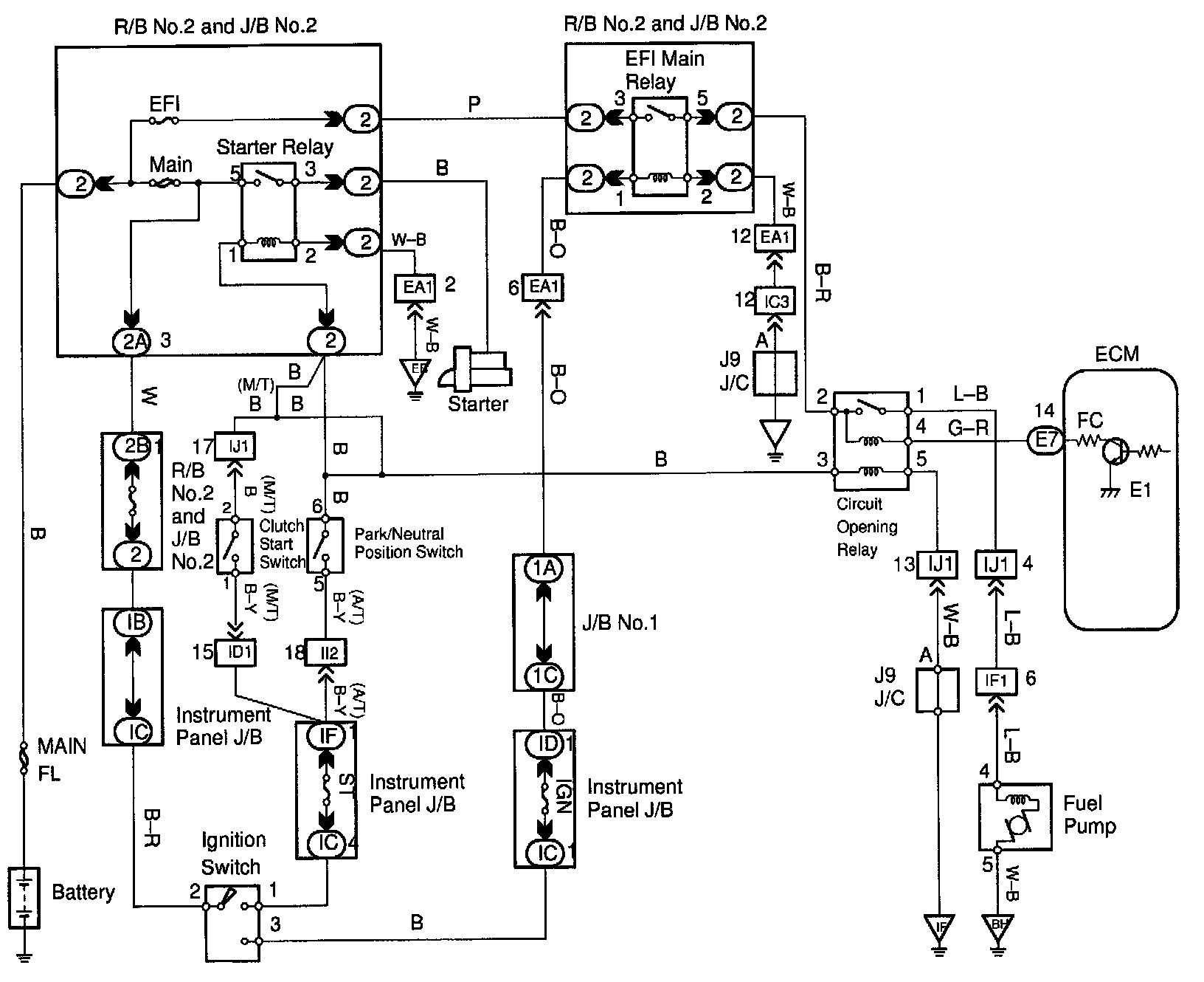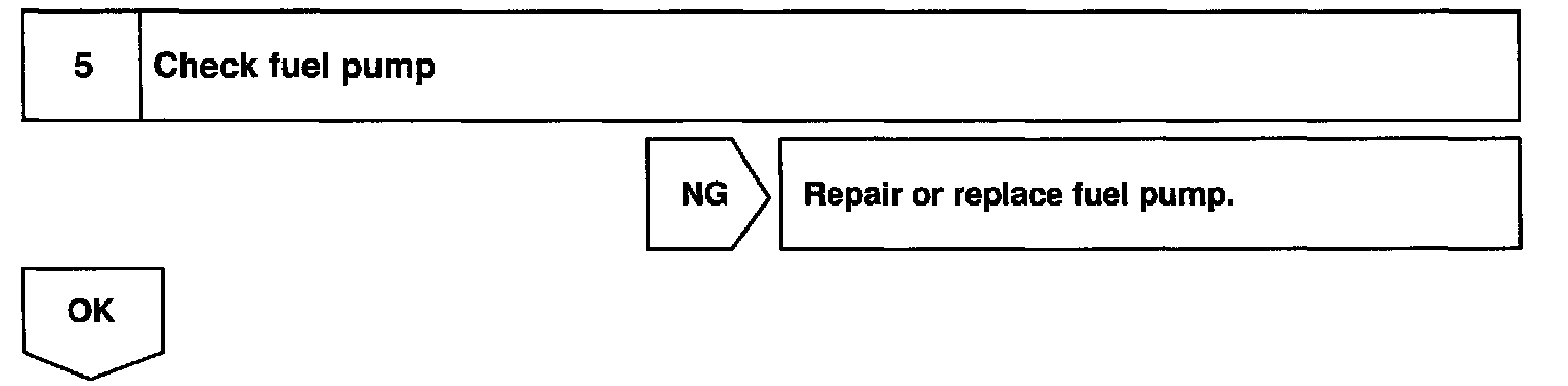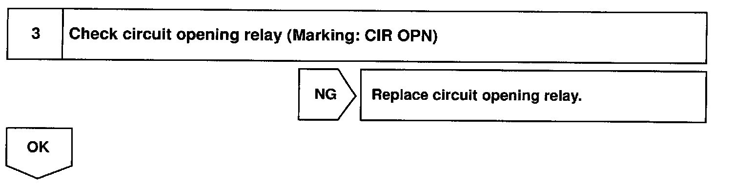 When the STA signal and NE signal are input to the ECM, Tr is turned ON, current flows to coil of the circuit opening relay, the relay switches on, power is supplied to the fuel pump and the fuel pump operates. While the NE signal is generated (engine running), the ECM keeps Tr ON (circuit opening relay ON) and the fuel pump also keeps operating.
