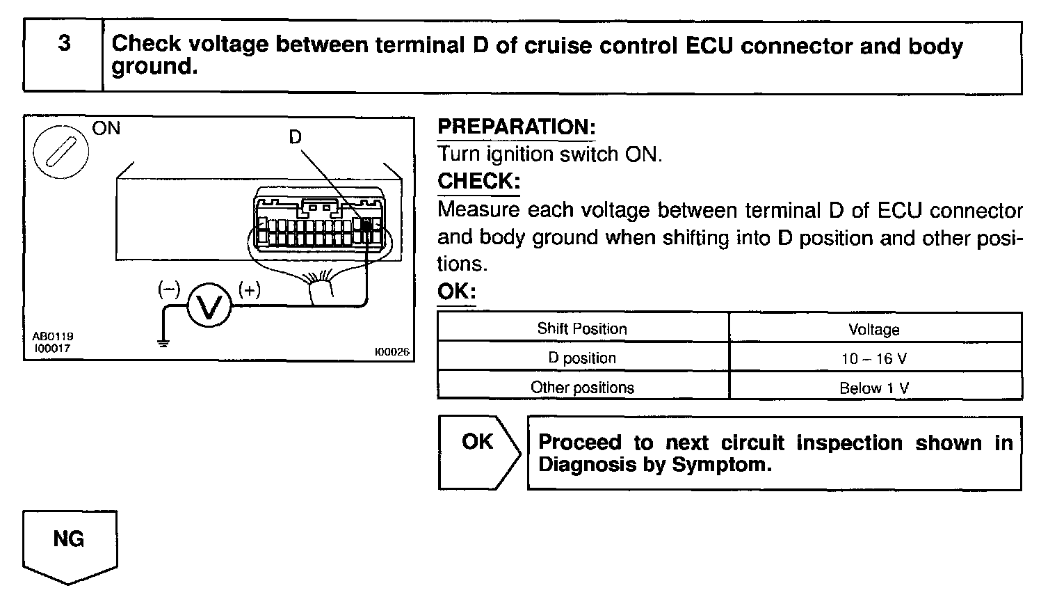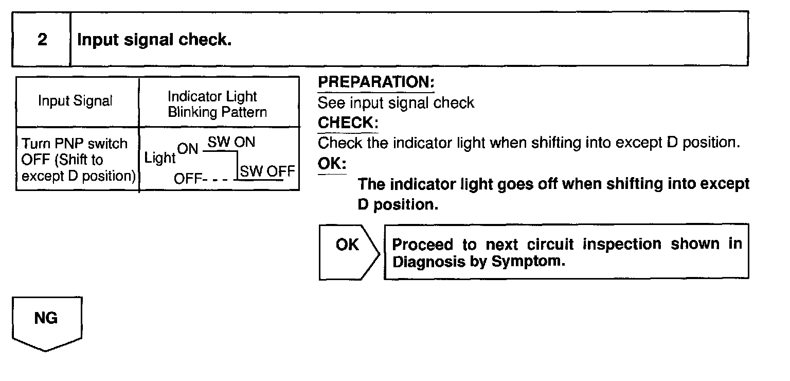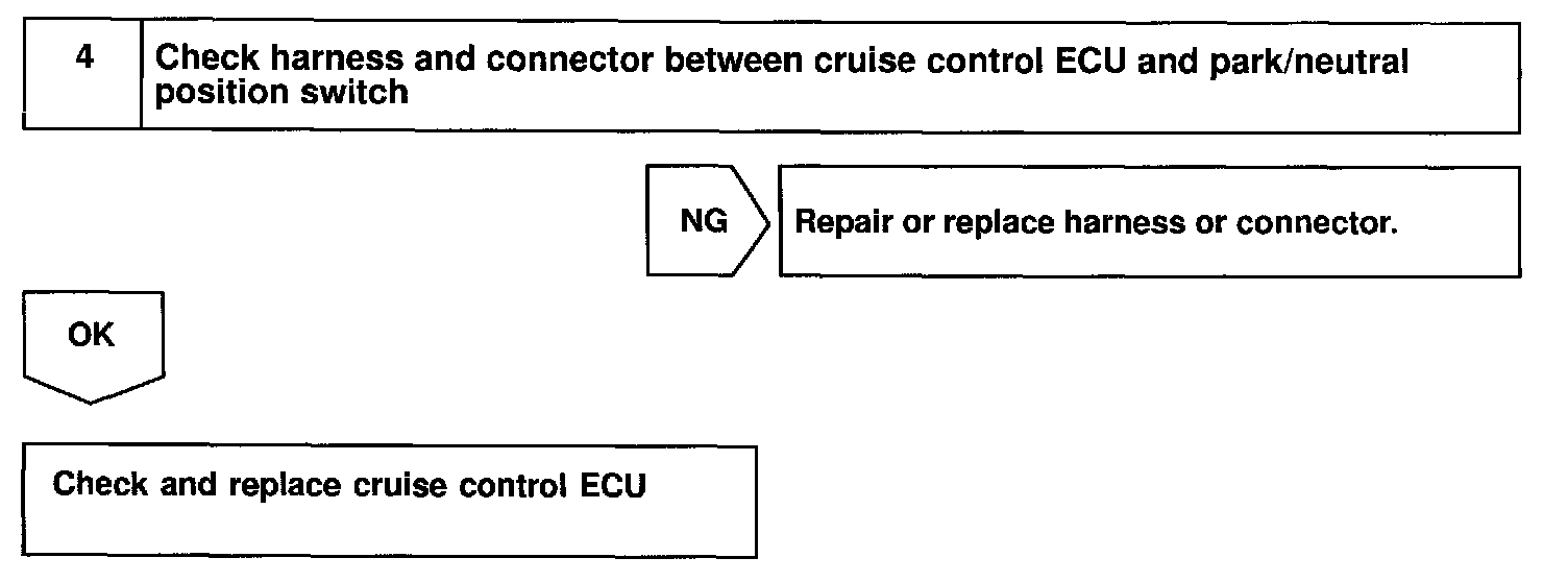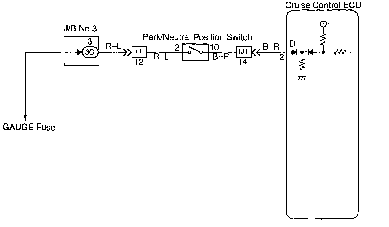 CIRCUIT DESCRIPTIONWhen the shift position is in except D position, a signal is sent from the park/neutral position switch to the ECU. When this signal is input during cruise control driving, the ECU cancels the cruise control.