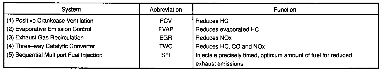 PURPOSEThe emission control Systems are installed to reduce the amount of HC, CO and NOx exhausted from the engine (3) (4) (5)), to prevent the atmospheric release of blow-by gas-containing HC (1) and evaporated fuel containing HC being released from the fuel tank (2).