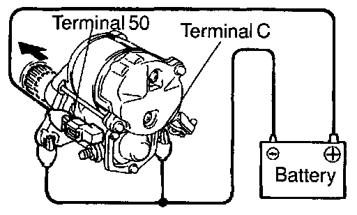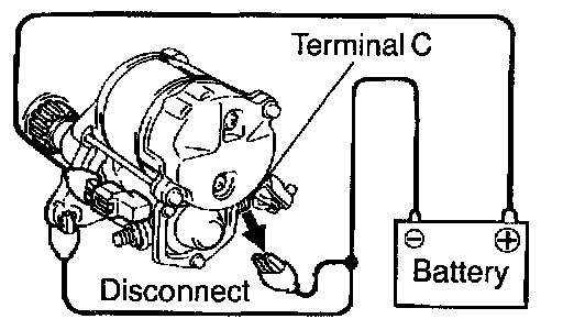 With battery connected as above with the clutch pinion gear out, disconnect the negative (-) lead from terminal C. Check that the pinion gear remains out.