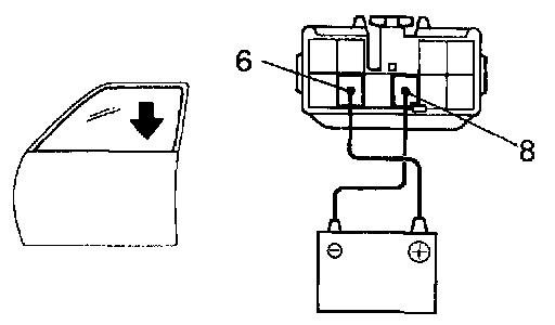 f. Approximately 90 seconds later, connect the positive (+) lead from the battery to terminal 6 and negative (-) lead to terminal 8, check that the window begins to descend.