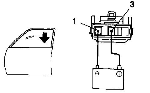 f. Approximately 90 seconds later, connect the positive (+) lead from the battery to terminal 3 and the negative (-) lead to terminal 1, check that the window begins to descend.