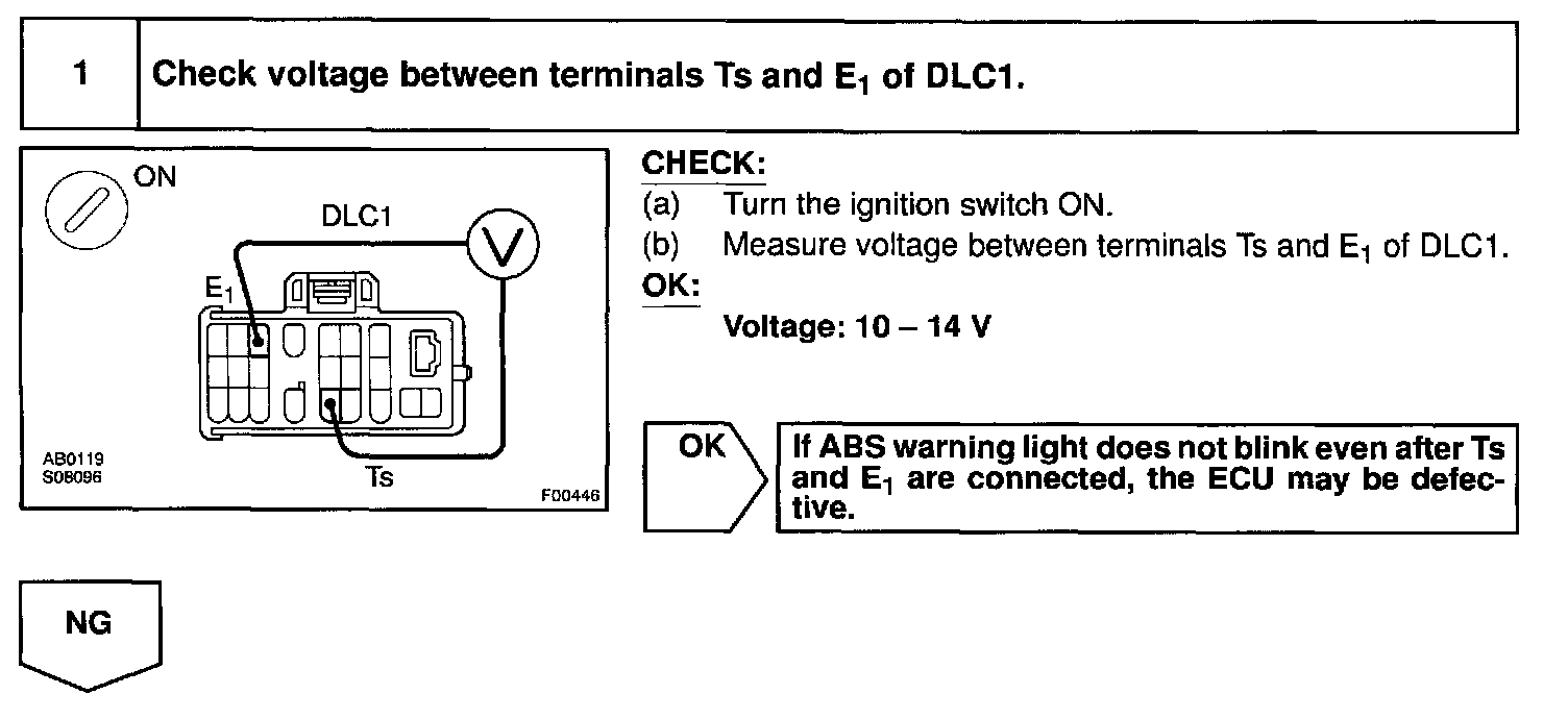 Connecting terminals Ts and E1 of the DLC1 in the engine compartment starts the check.