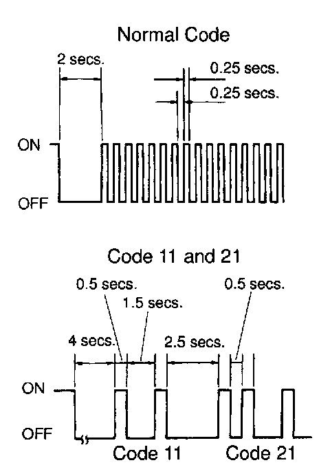 - As an example, the blinking patterns for normal code and codes 11 and 21 are shown on the left.
