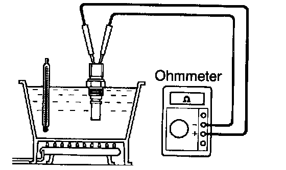 a. Using an ohmmeter, check that there is no continuity between the terminals when the coolant temperature is above 93° C (199° F).