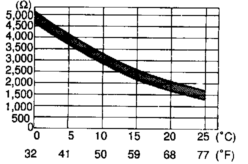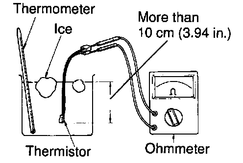 a. Place the thermistor in cold water, and while changing the temperature of the water, measure resistance at the connector and at the same time, measure temperature of the water with a thermometer.