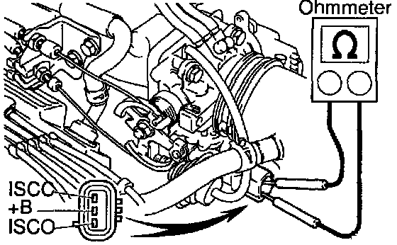 b. Using an ohmmeter, measure the resistance between terminal +B and other terminals (ISCC, ISCO).