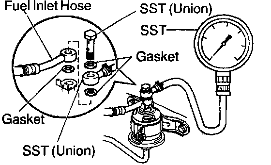 d. Install the fuel inlet hose and SST (pressure gauge) to the fuel filter outlet with the 3 gaskets and SST (union bolt).