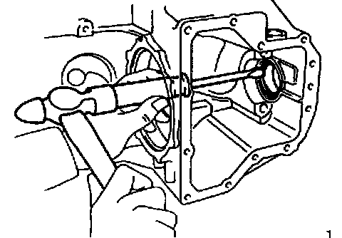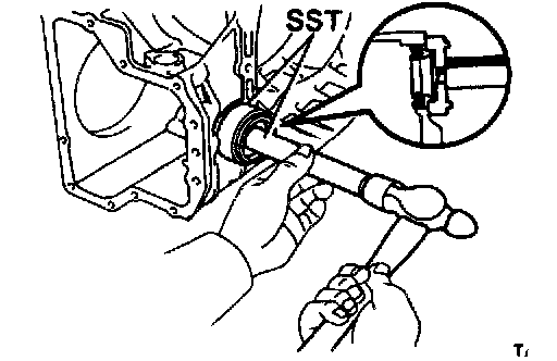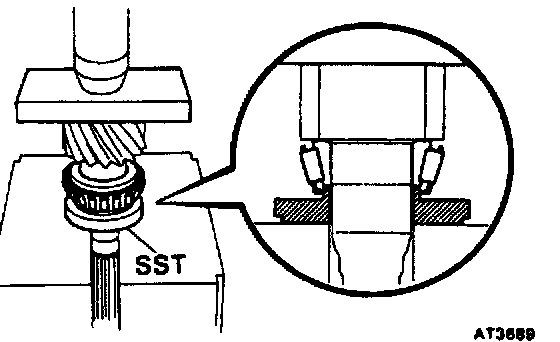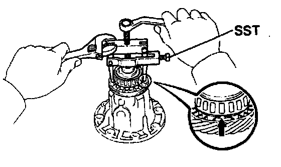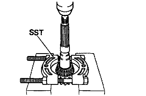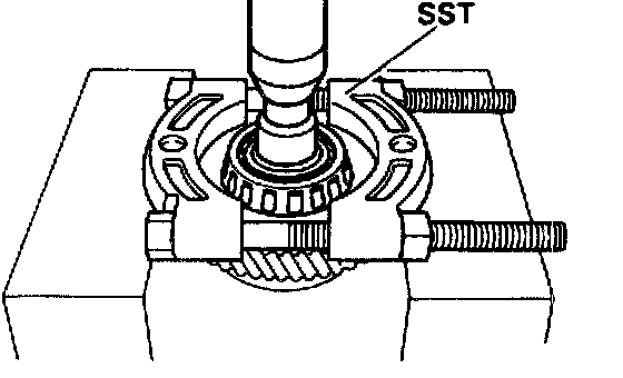 Fasten Special Service Tools (SST) under the bearing above the cutouts on the speedometer drive gear. Remove the bearing from the case.