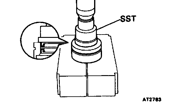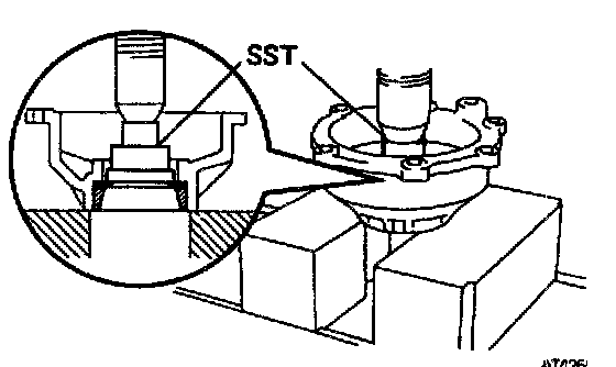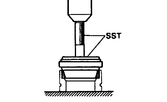c. With the oil seal lip facing upward, use SST to press in a new oil seal until its end is flush with the surface of the cage.