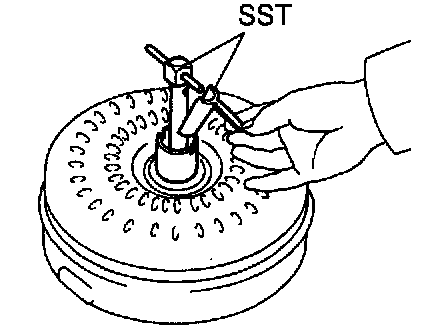 b. Install SST so that it fits in the notch of the converter hub and outer race of the one-way clutch.