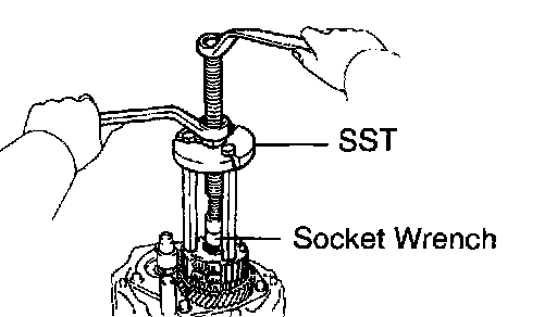b. Using SST and a socket wrench, remove the No. 3 clutch hub with the synchronizer ring.
